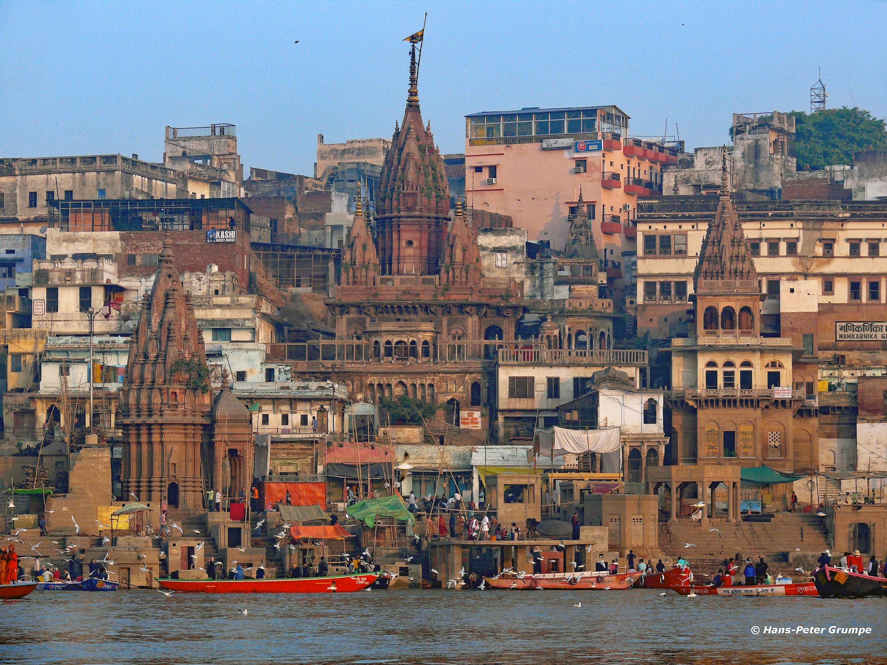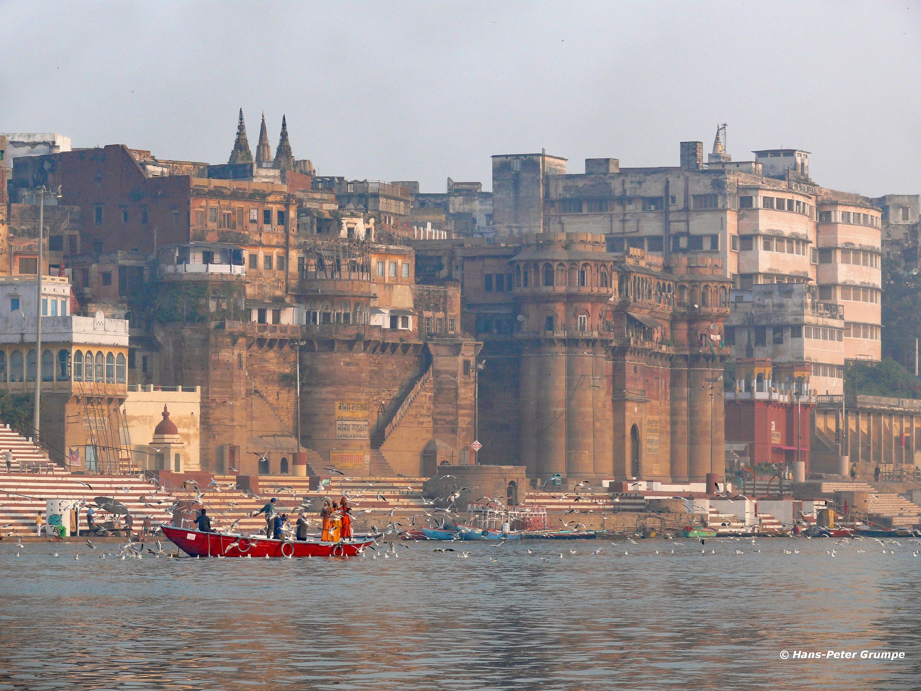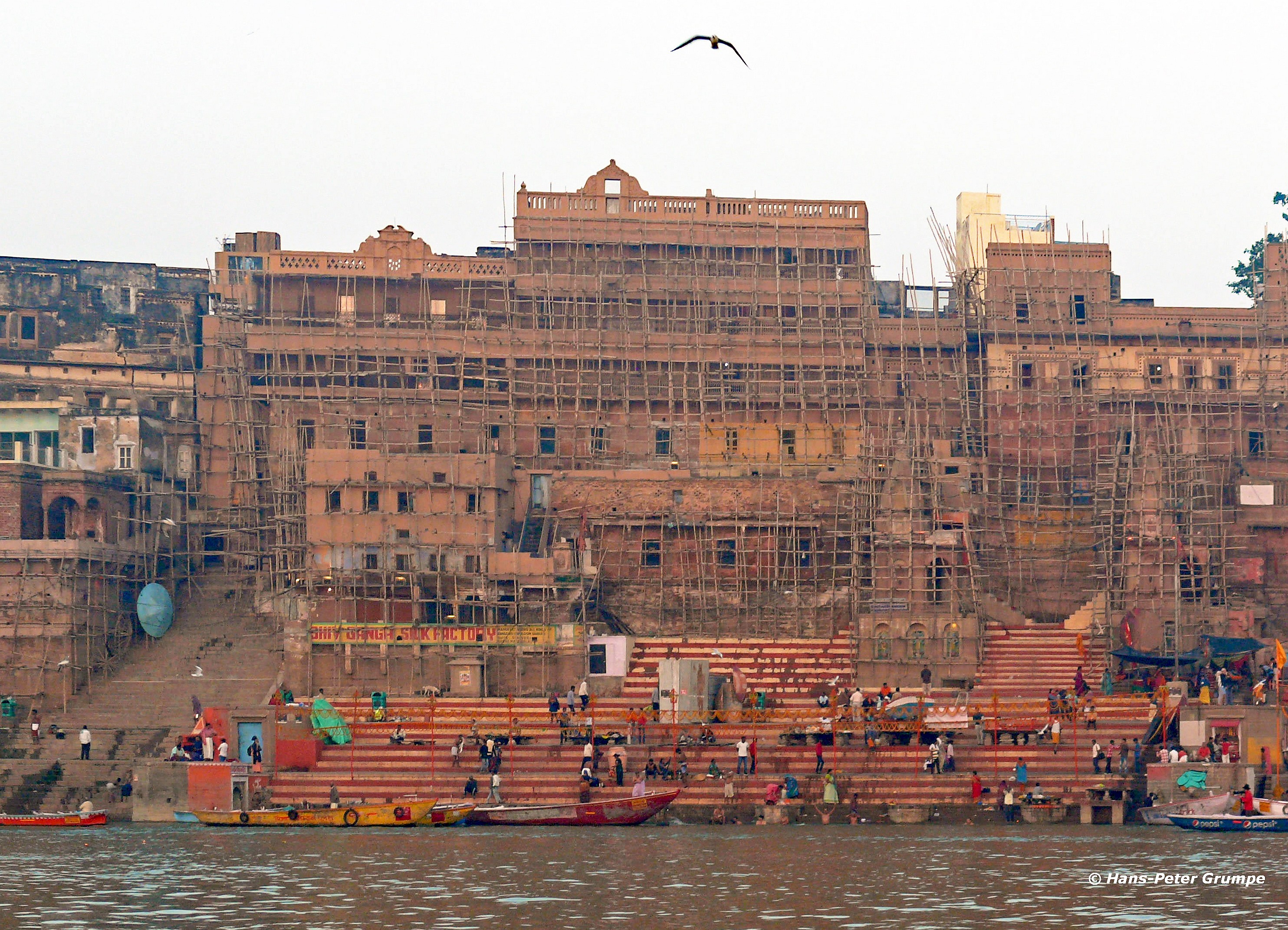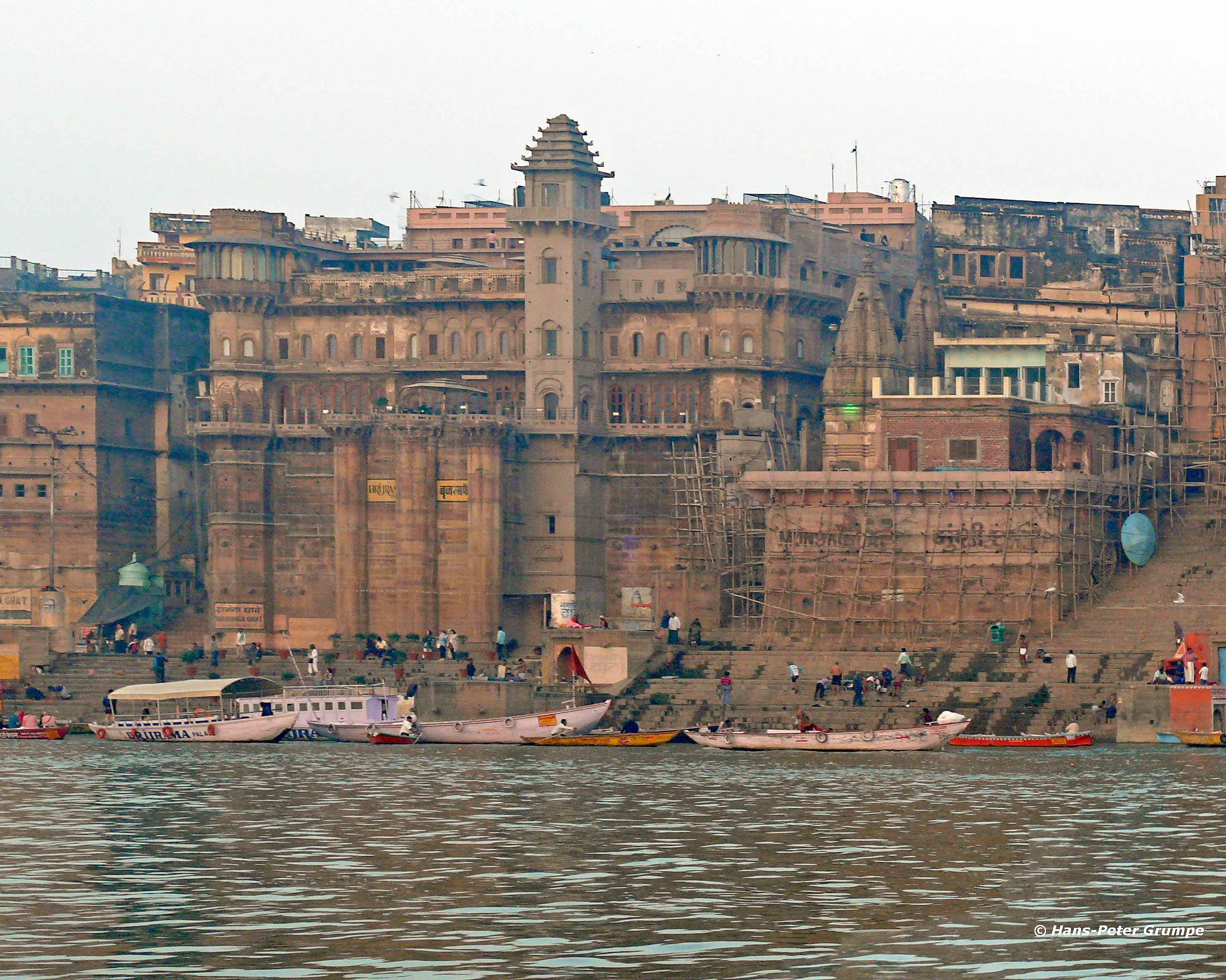 Varanasi: Frühmorgens auf dem Ganges - v.l.: Sankatha Ghat, Ganga Mahal Ghat und Bhonsale Ghat
