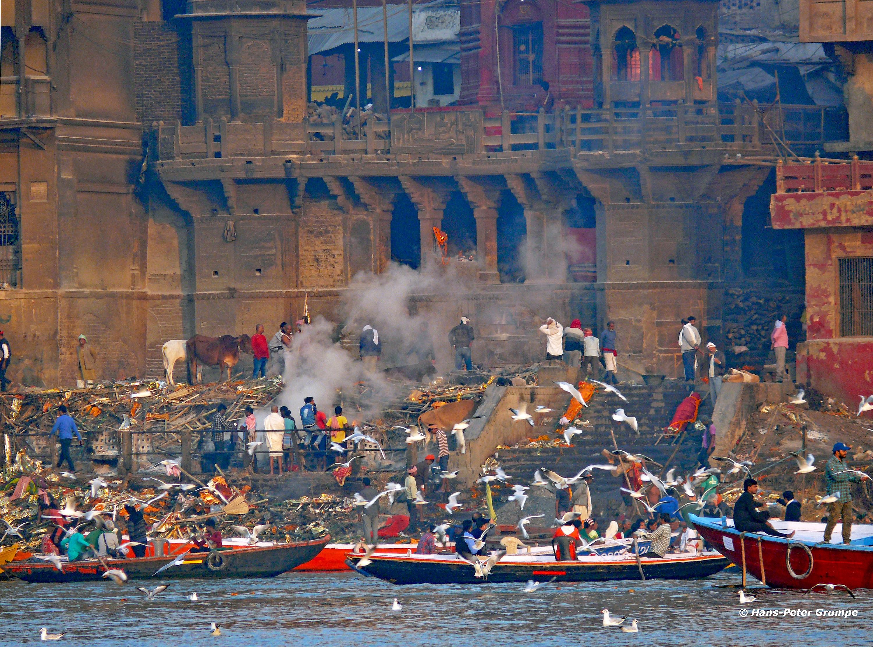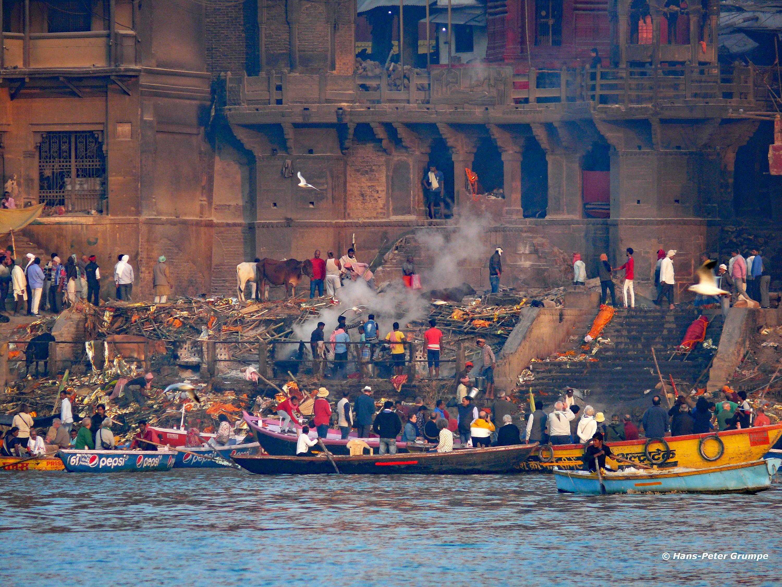 Varanasi: Frühmorgens auf dem Ganges - Jalasen Ghat, Leichen Verbrennungsstätte