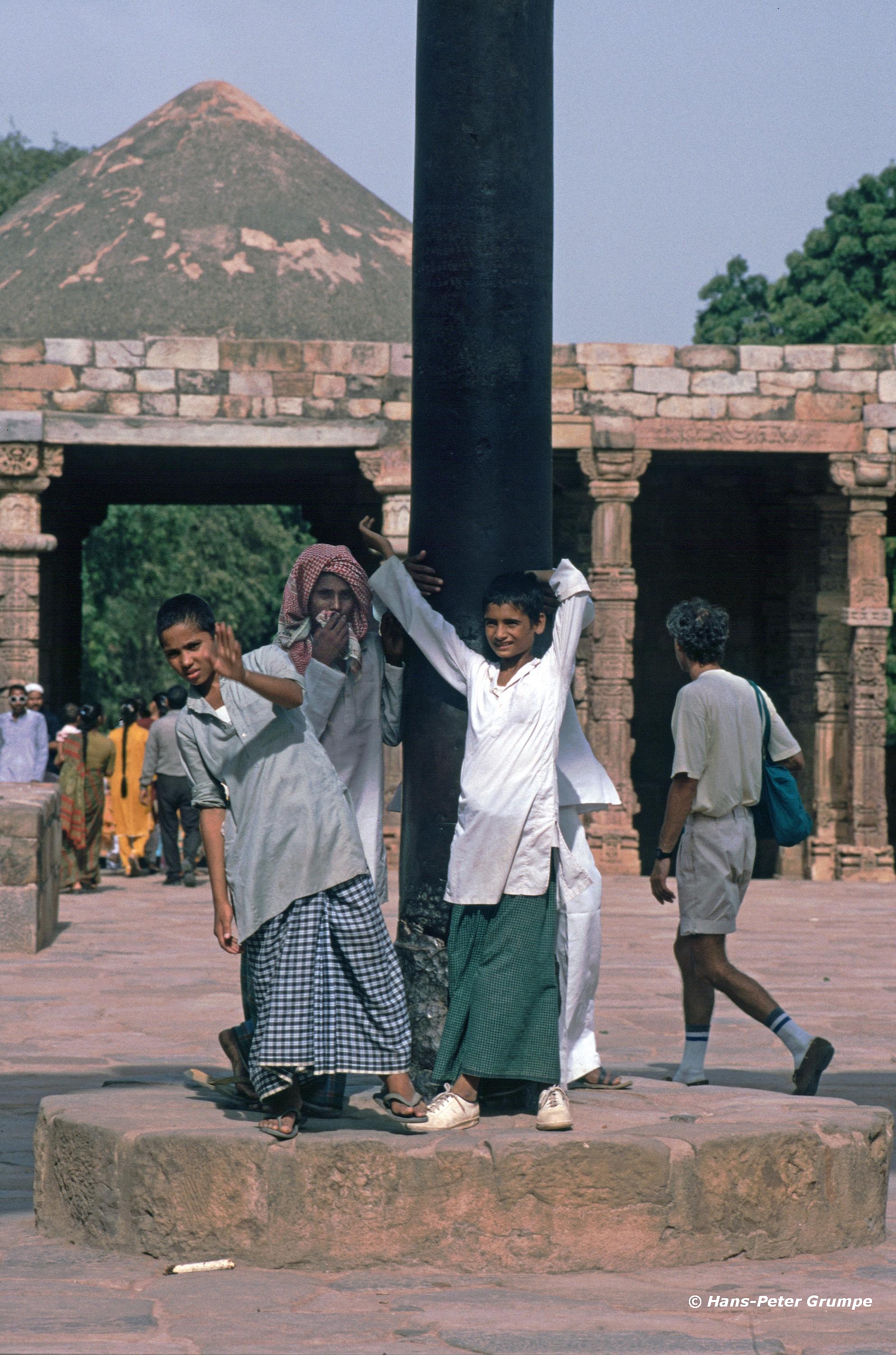 Delhi 1989: Quwwat-ul-Islam-Moschee - 'Eiserne Säule' (ca. 400 n.Chr.), weltweit eines der ältesten erhaltenen Monumente aus Metall. Im Volksglauben wird behauptet, dass derjenige, der sich mit dem Rücken an die Eiserne Säule stellt, sie rückwärts mit den Händen umfasst und dessen Fingerspitzen sich dabei berühren, besonders viel Glück haben solle.