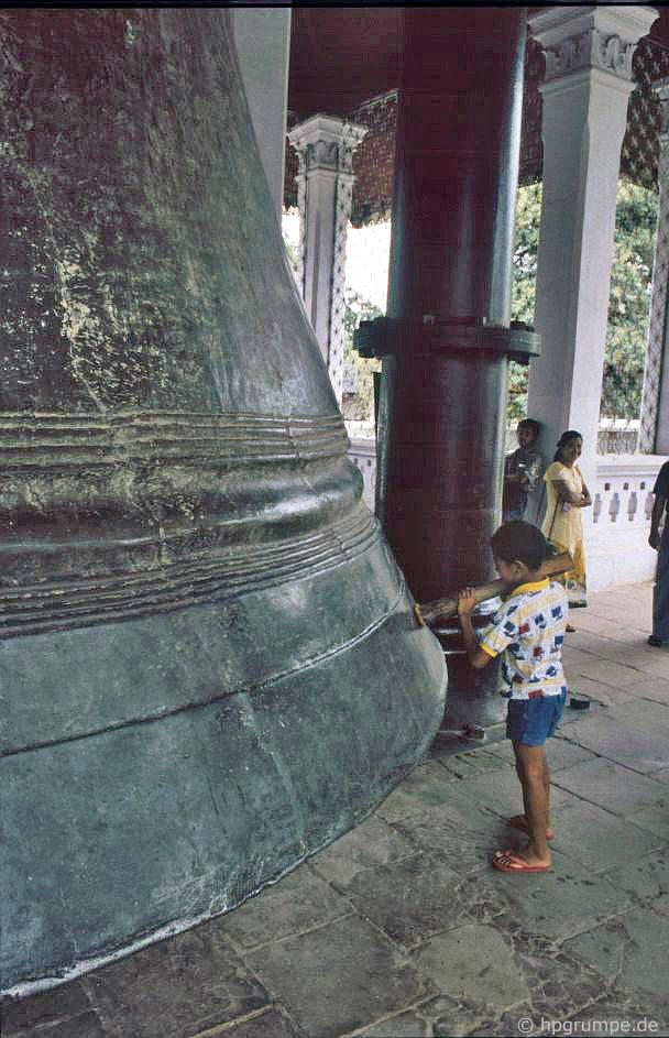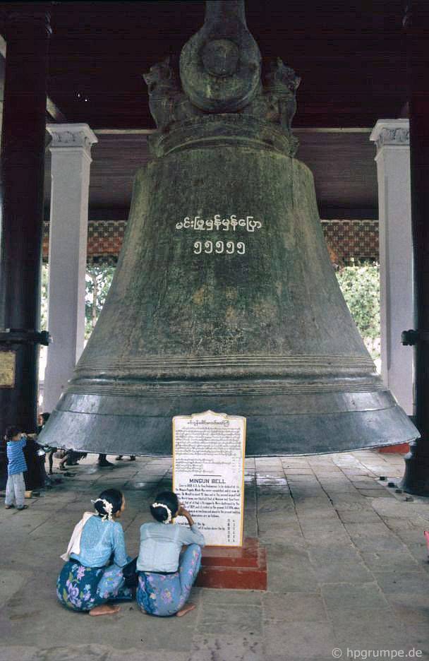 Die zweitgrößte Glocke der WeltDie Glocke von Mingun ist die zweitgrößte der Welt. Die größte ist die 'Zarenglocke', steht auf einem Granitsockel vor dem Moskauer Kreml, hat einen Sprung und ist daher nie geläutet worden. Die Mingun-Bell wurde 1790 gegossen und sollte in der großen Mingun-Pagode ihren Platz haben. Der Glockengießer wurde nach vollbrachter Arbeit getötet, damit er nicht noch einmal solch ein Werk vollbringen konnte. Die Glocke wiegt 87 Tonnen, ist 4 m hoch und hat einen Durchmesser von 5 m. |