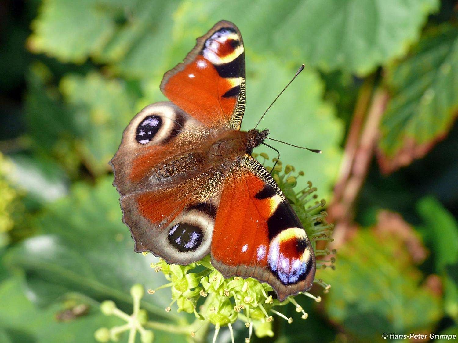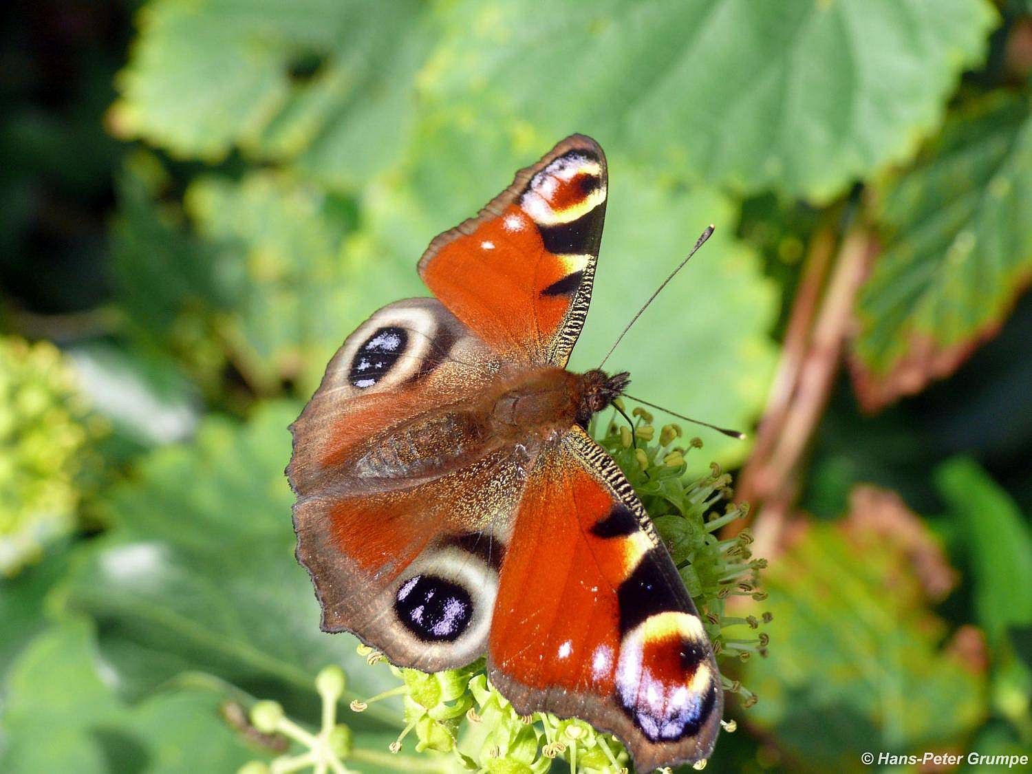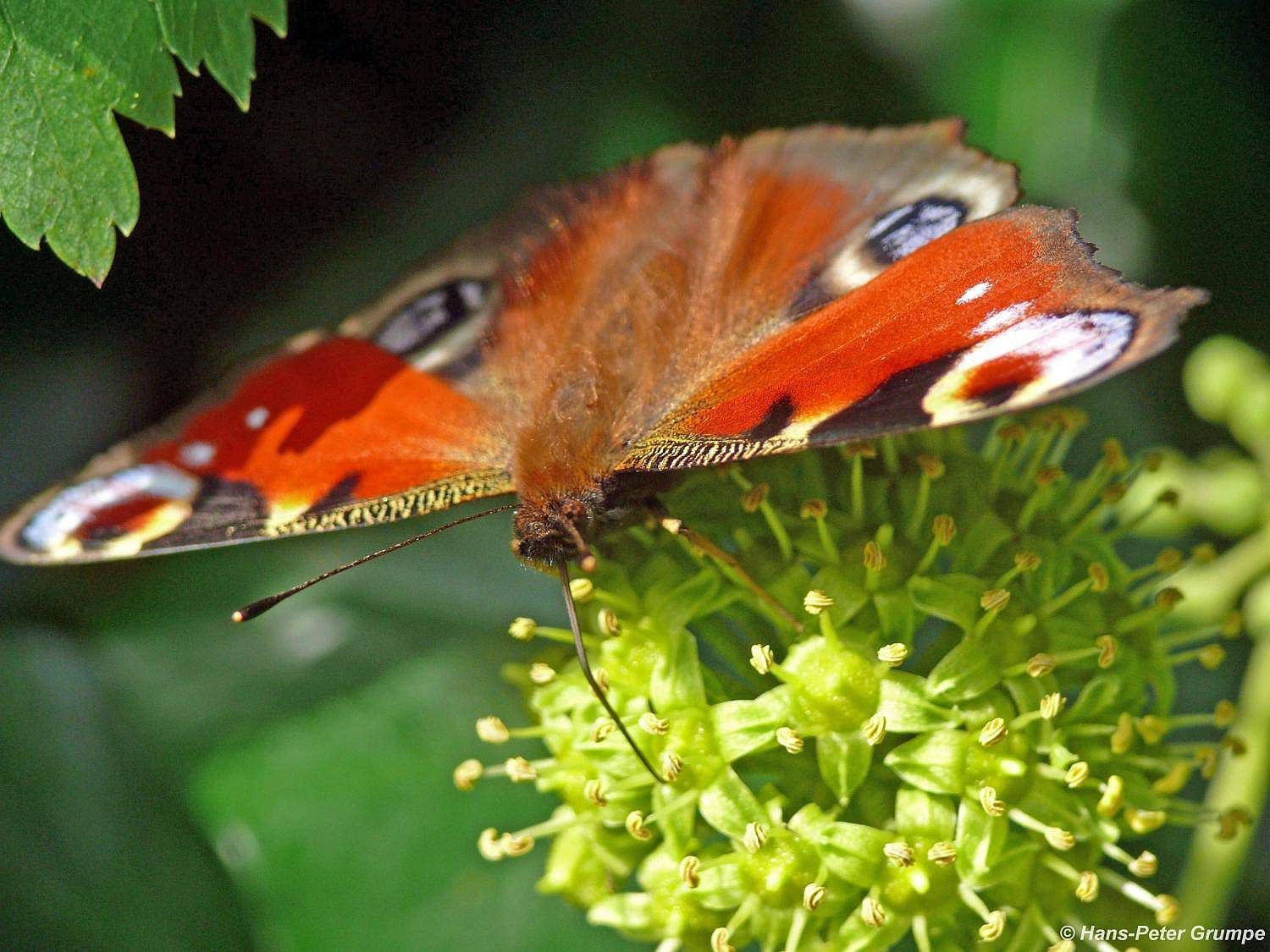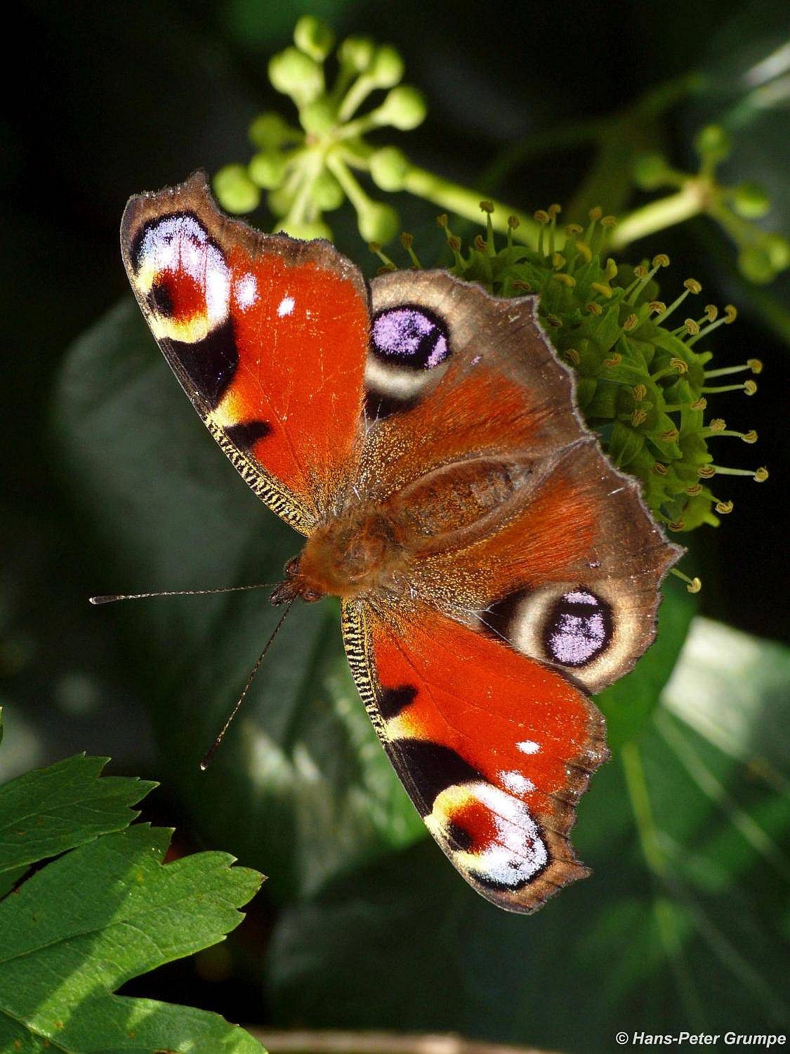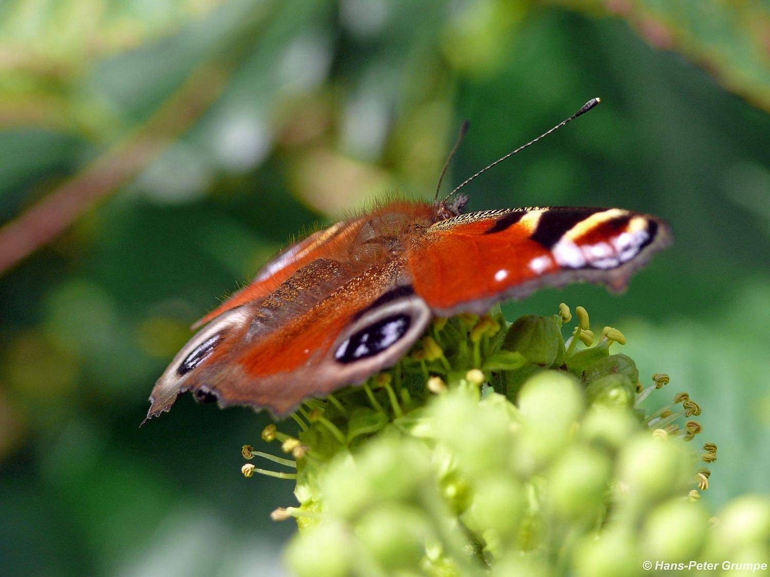 Tagpfauenauge (Aglais io; Syn.: Inachis io, Nymphalis io) auf Efeu-Blütenstand