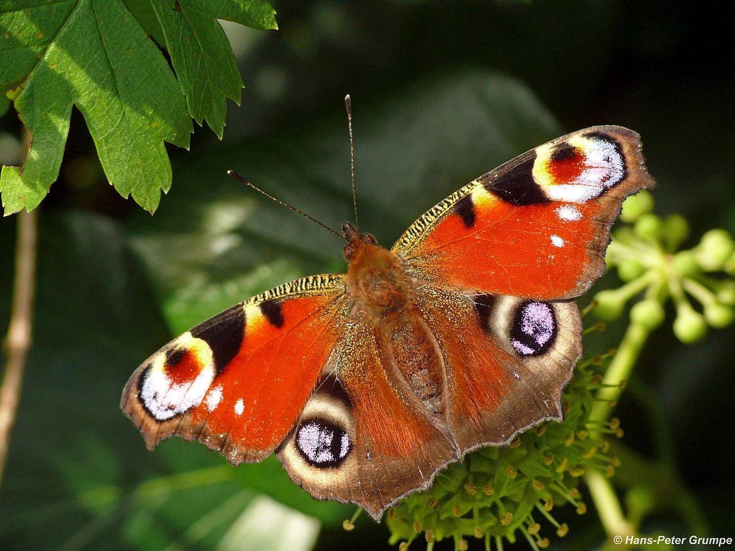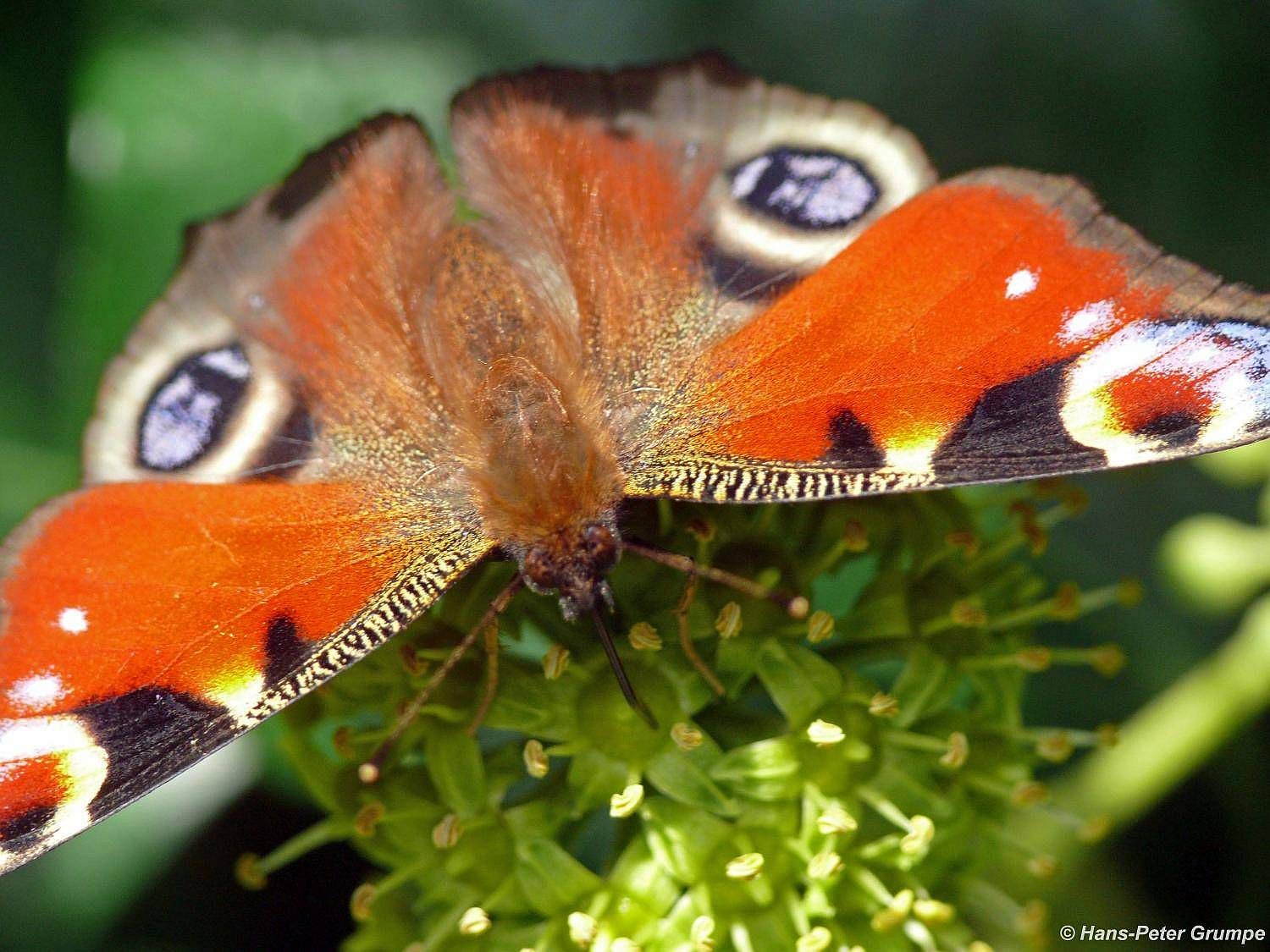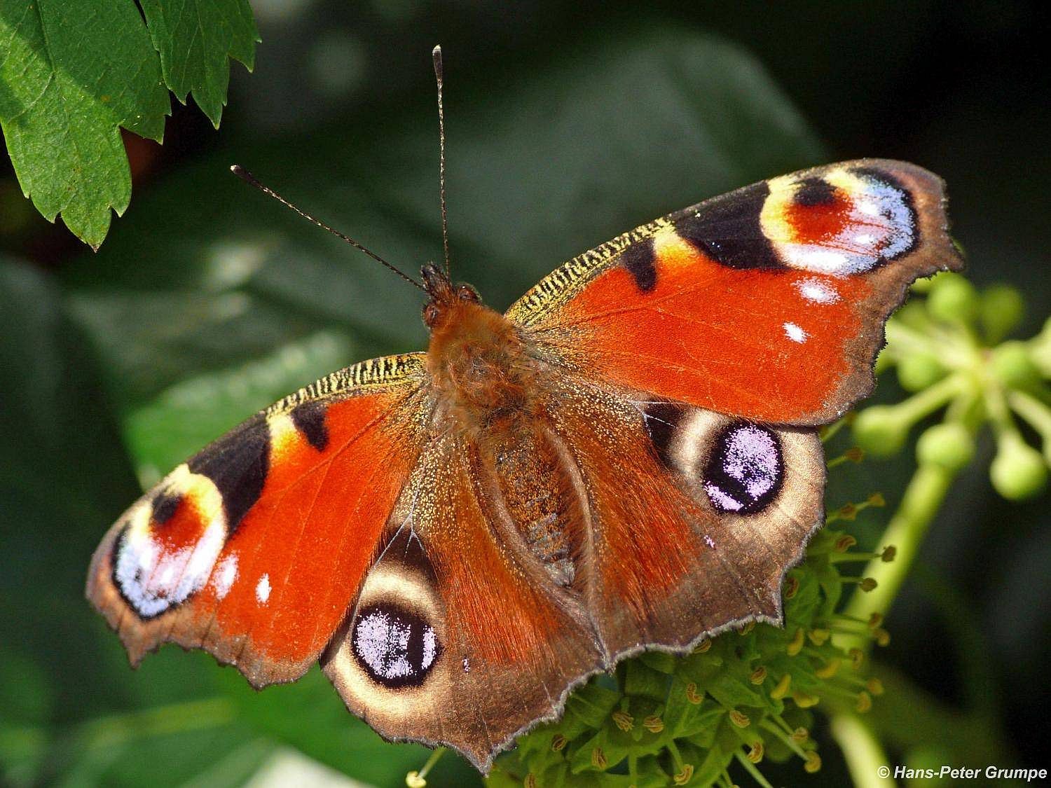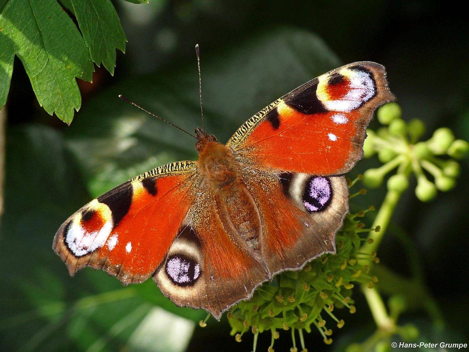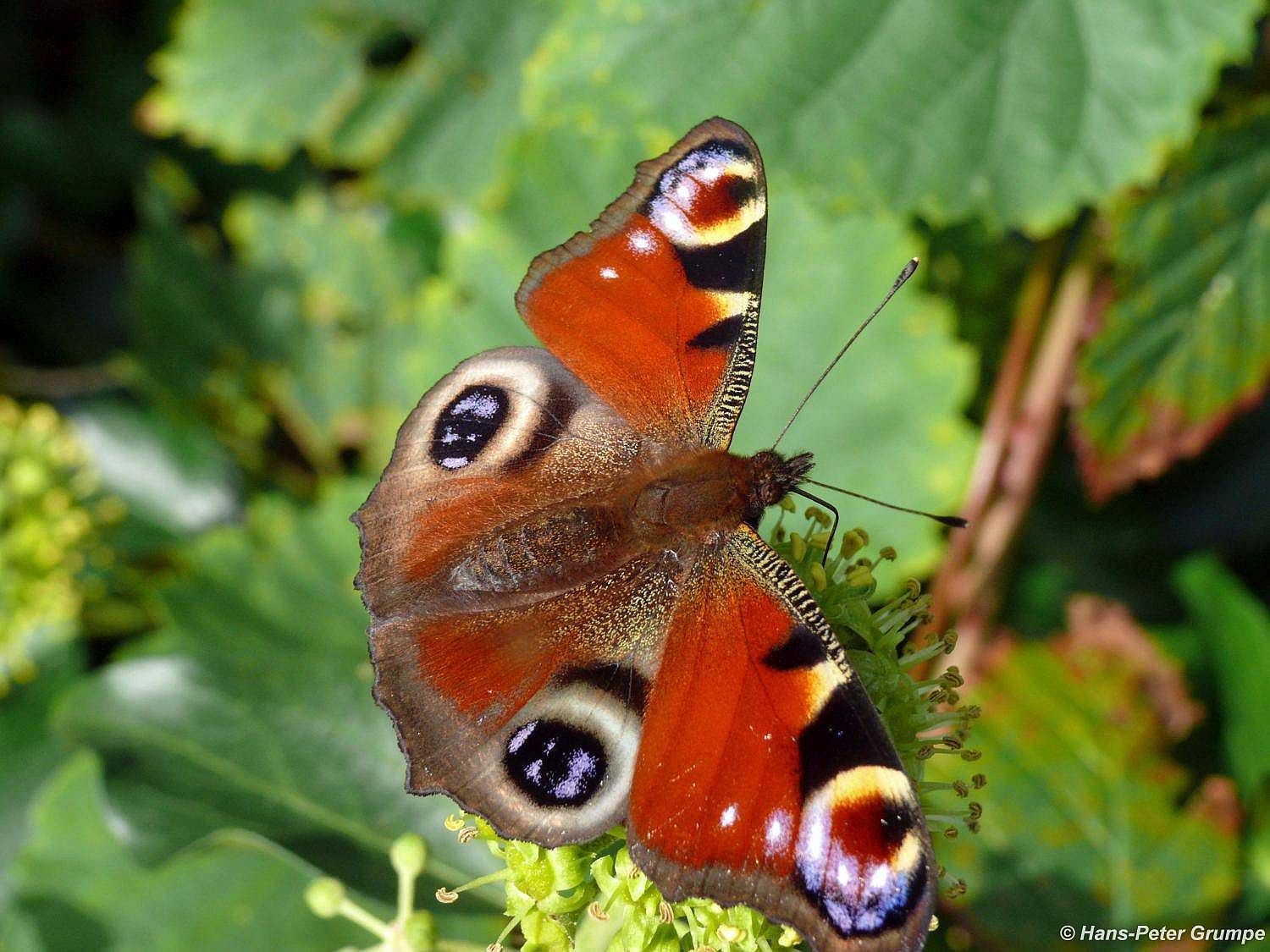 Tagpfauenauge (Aglais io; Syn.: Inachis io, Nymphalis io) auf Efeu-Blütenstand