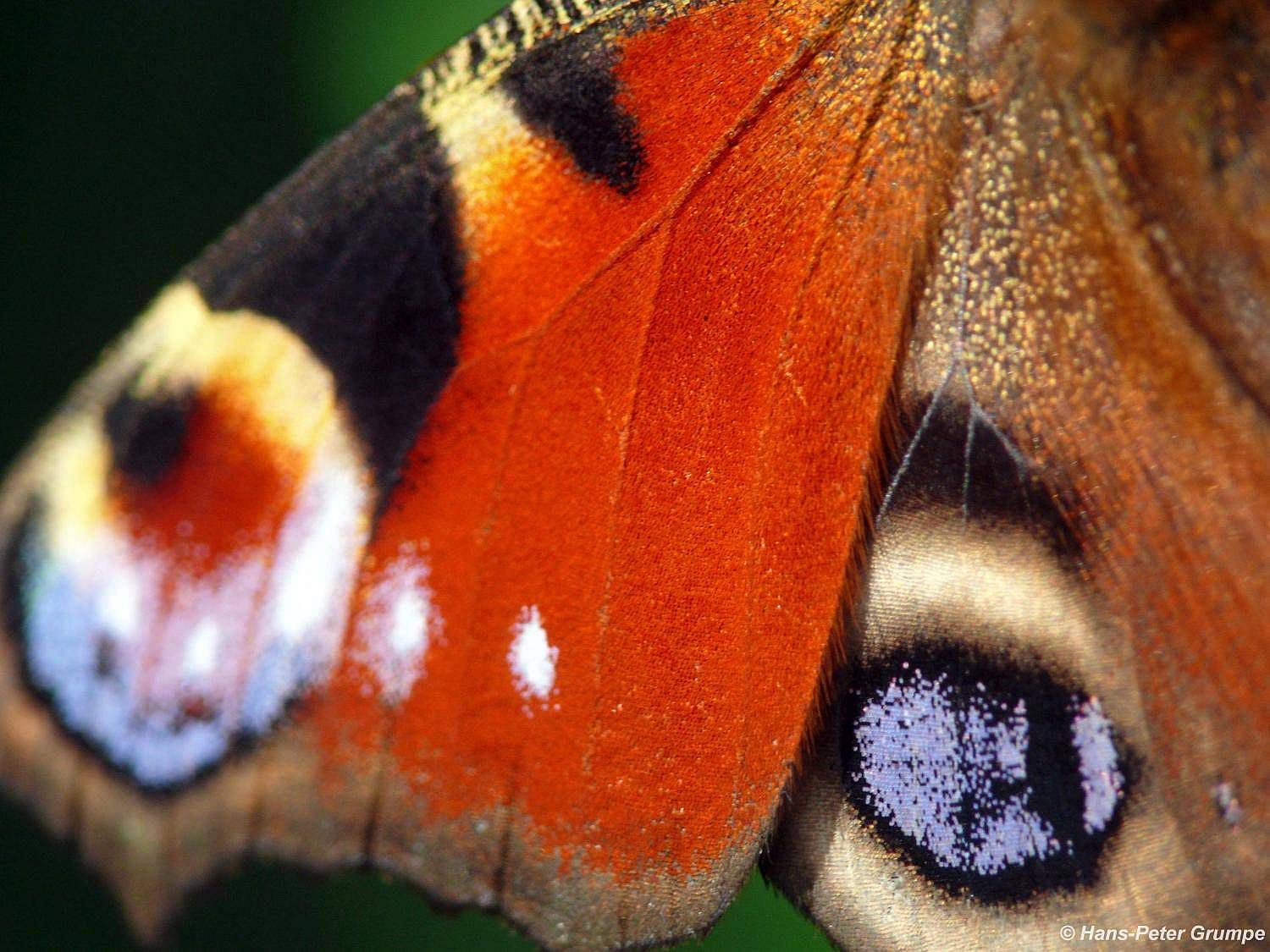 Tagpfauenauge (Aglais io; Syn.: Inachis io, Nymphalis io), Flügeldetail