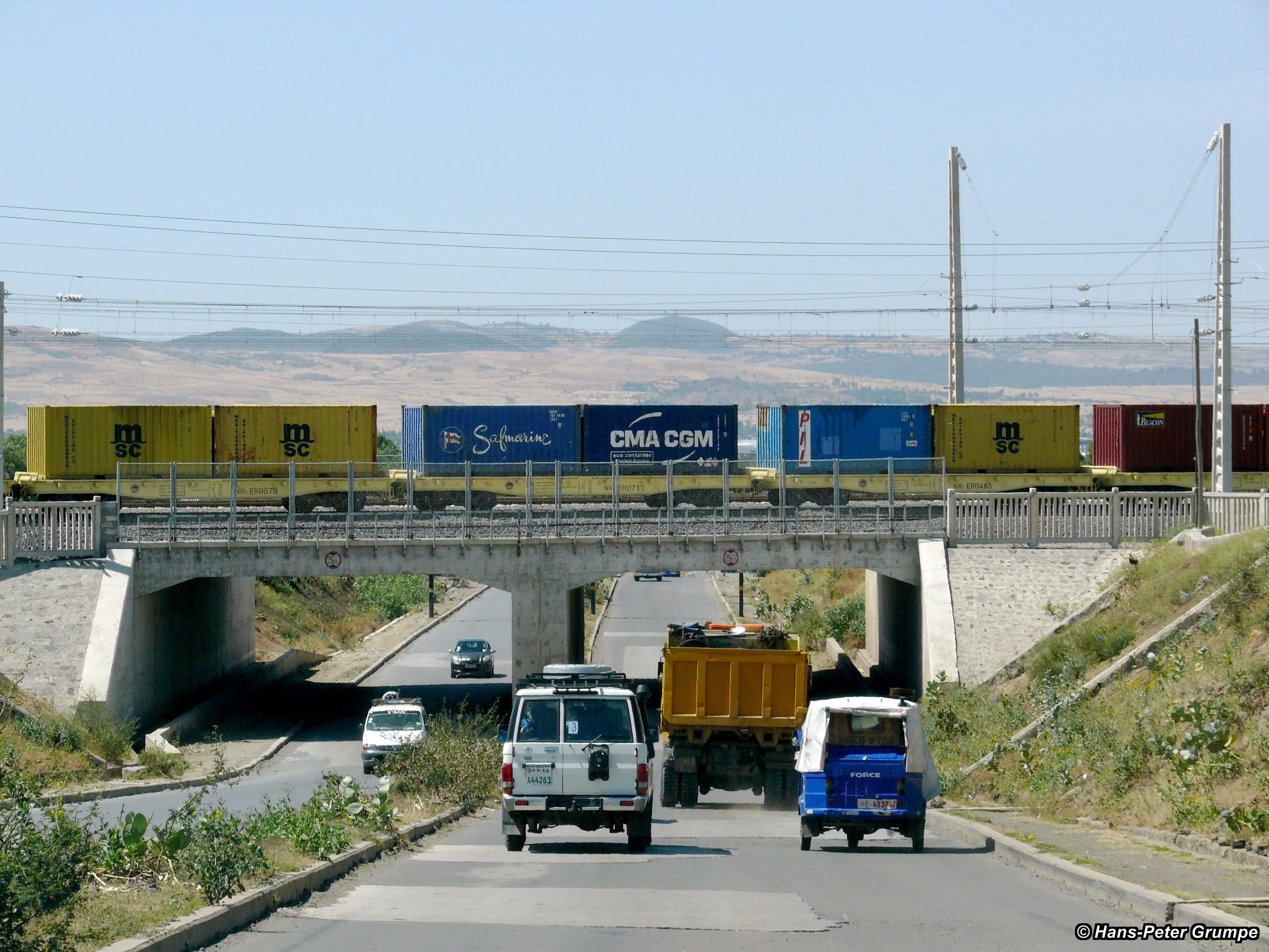 Fahrt nach Awassa: Container-Zug Richtung Dschibuti; die Bahnstrecke zwischen Addis Abeba und Dschibuti wurde von Chinesen erbaut, ist normalspurig und elektrifiziert und wurde 2016 eröffnet.