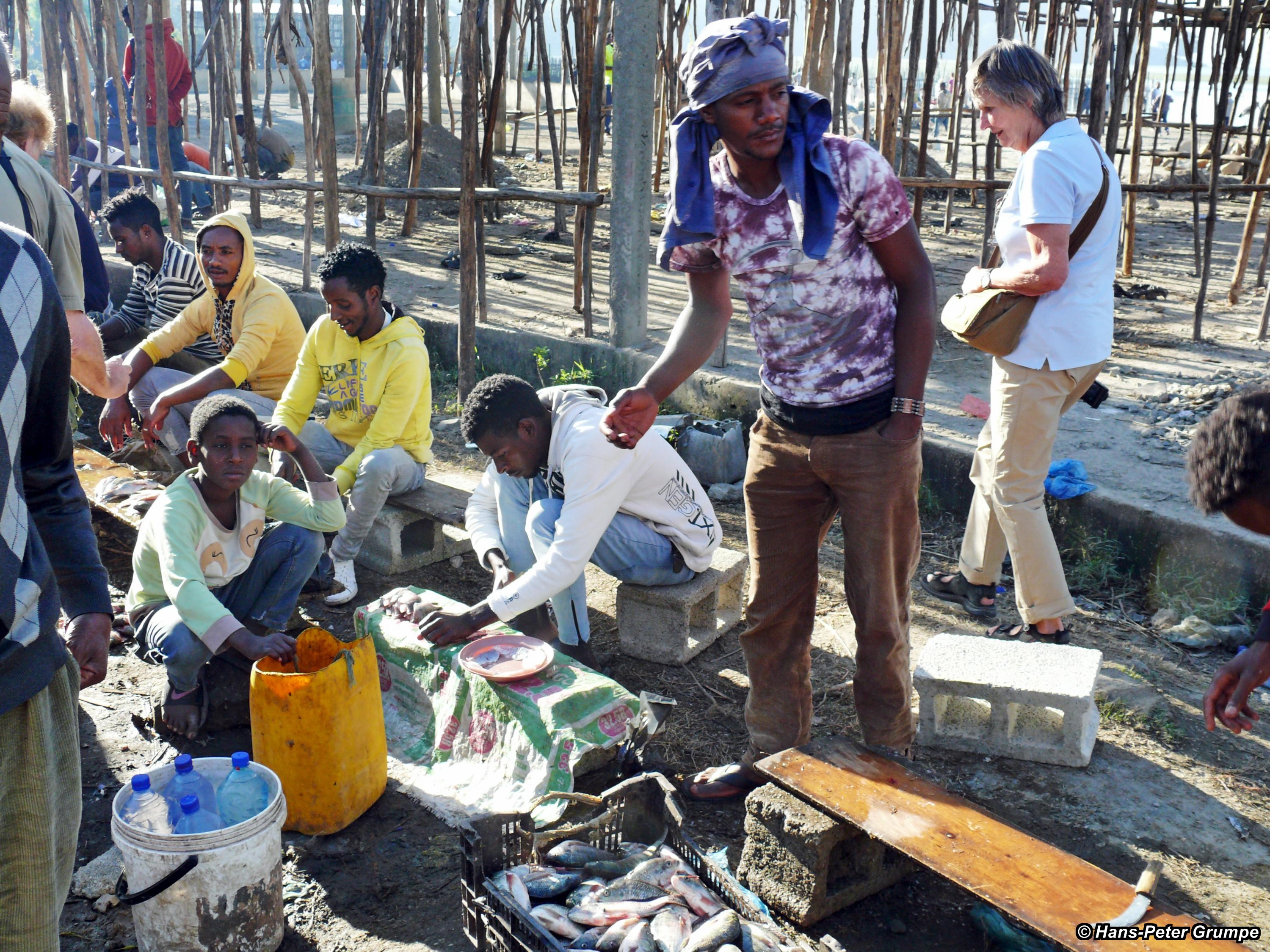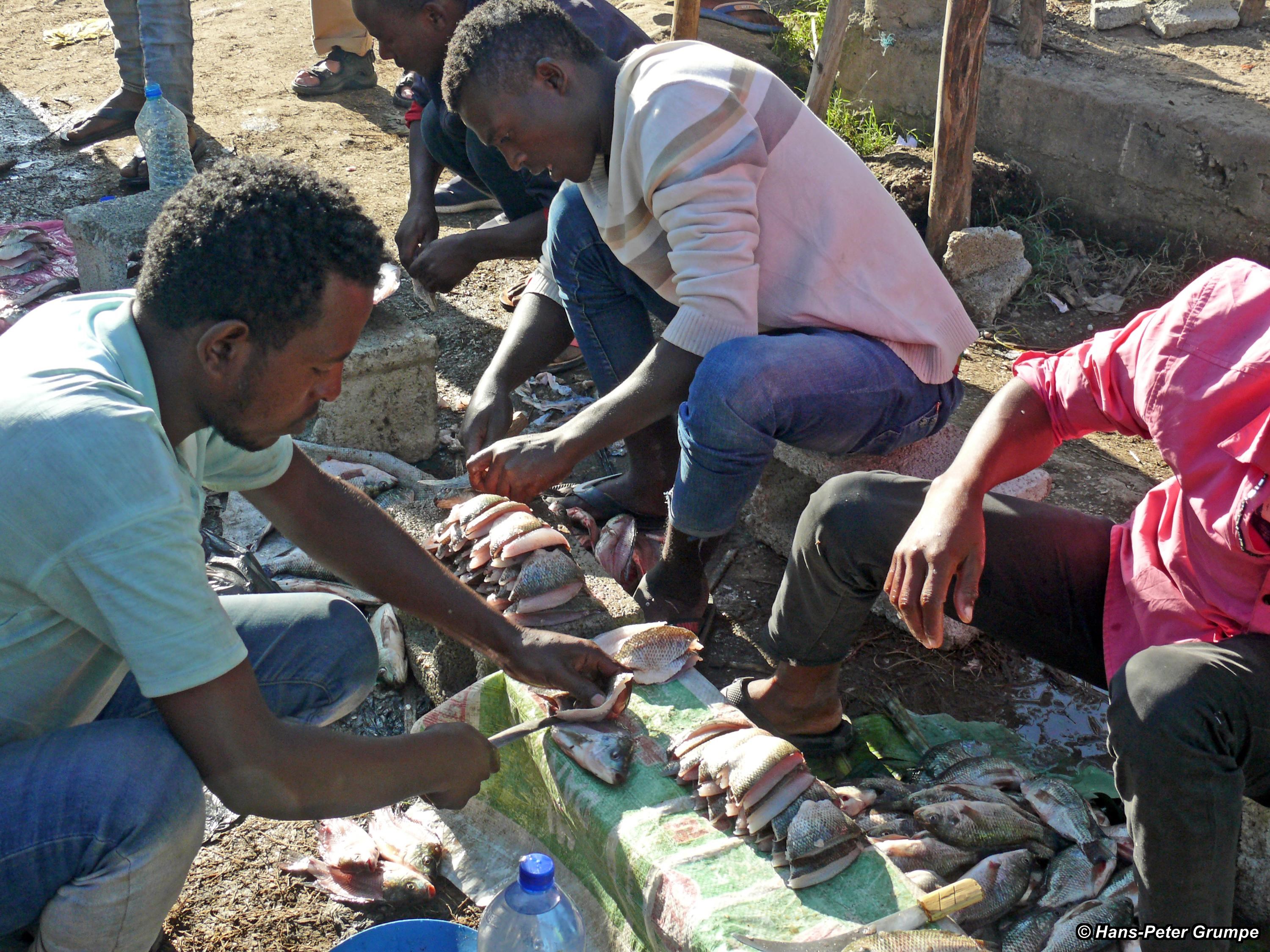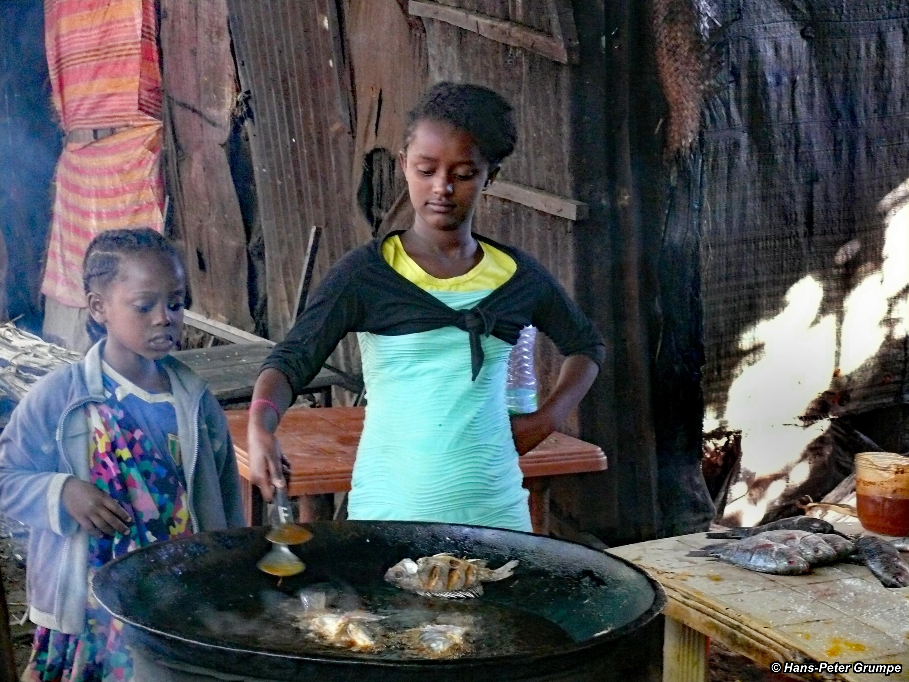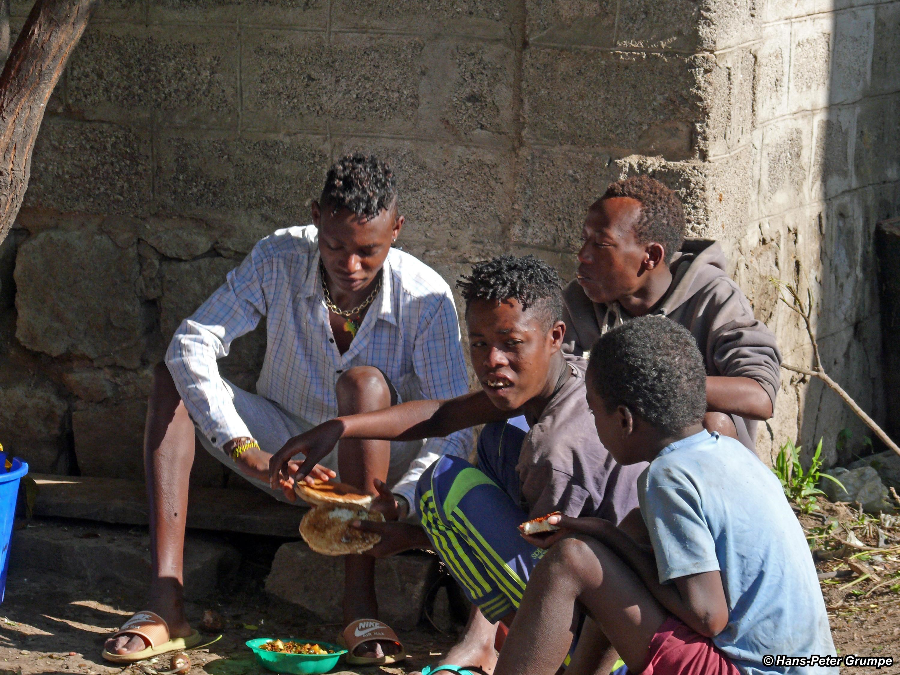 Awassa-See: Fischmarkt - Jugendliche beim Essen