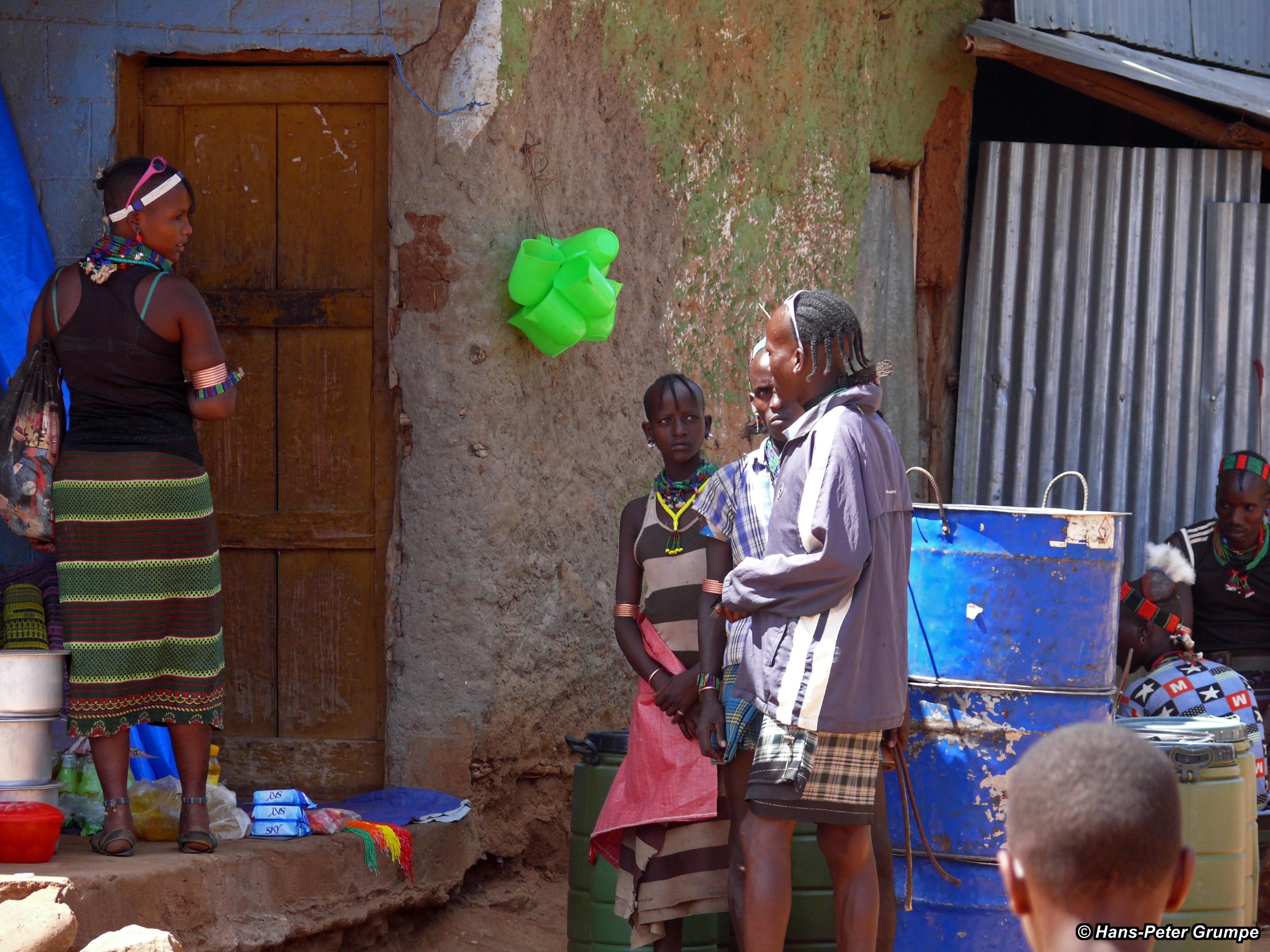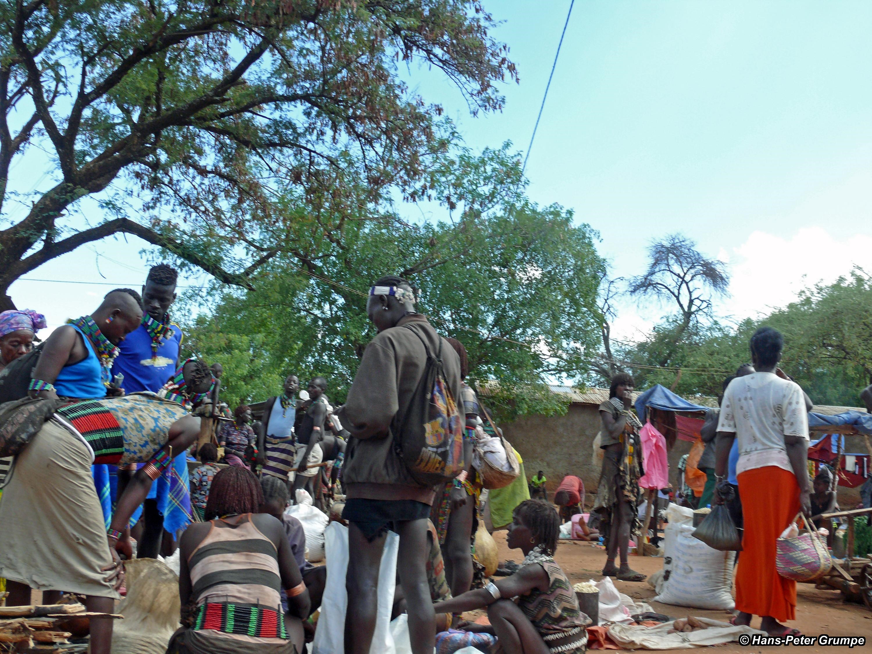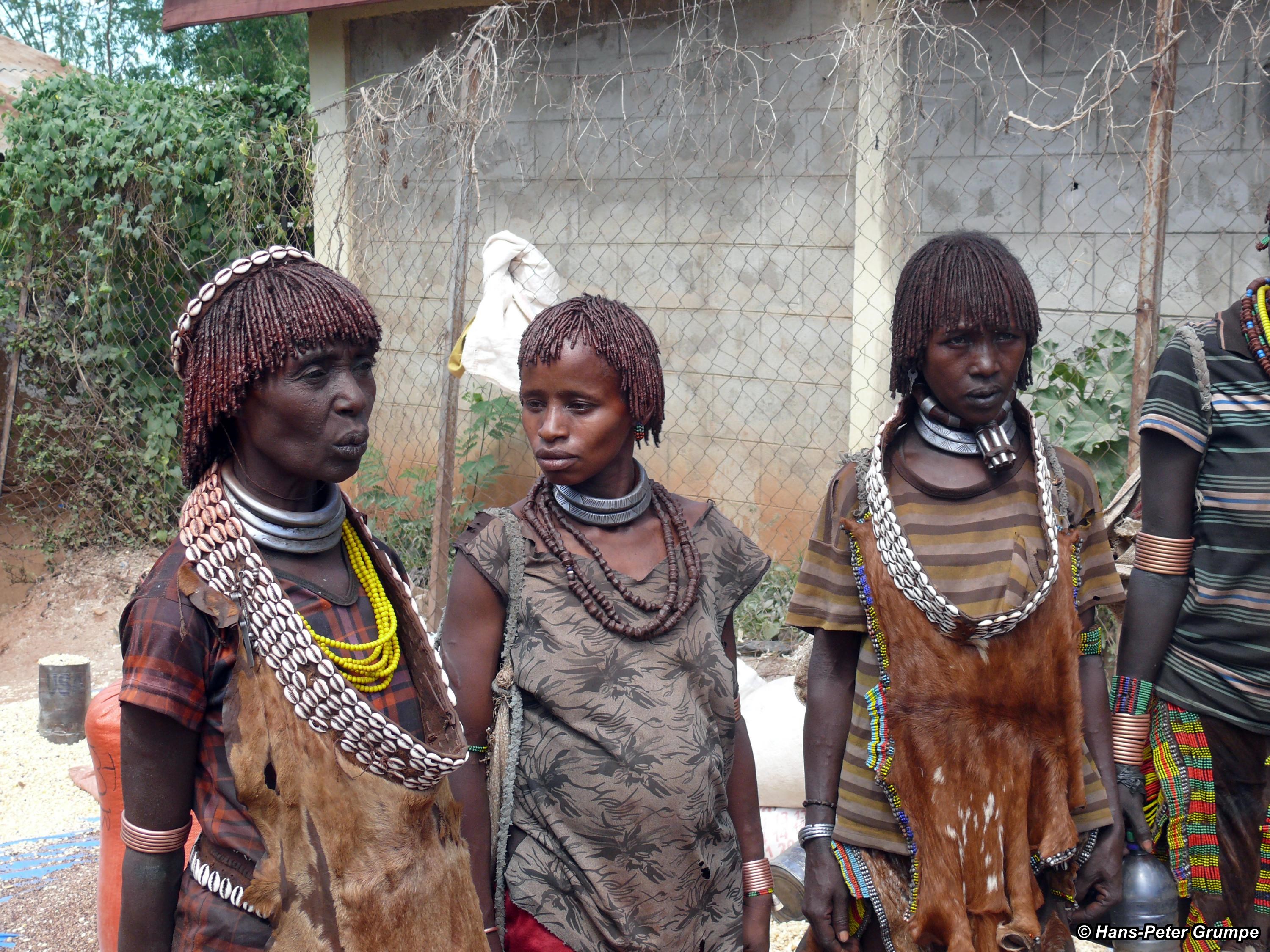 Dimeka: Markt - Hamar-Frauen; die Anzahl der metallenen Halsringe zeigt, die wievielte Frau ihres Mannes sie ist.