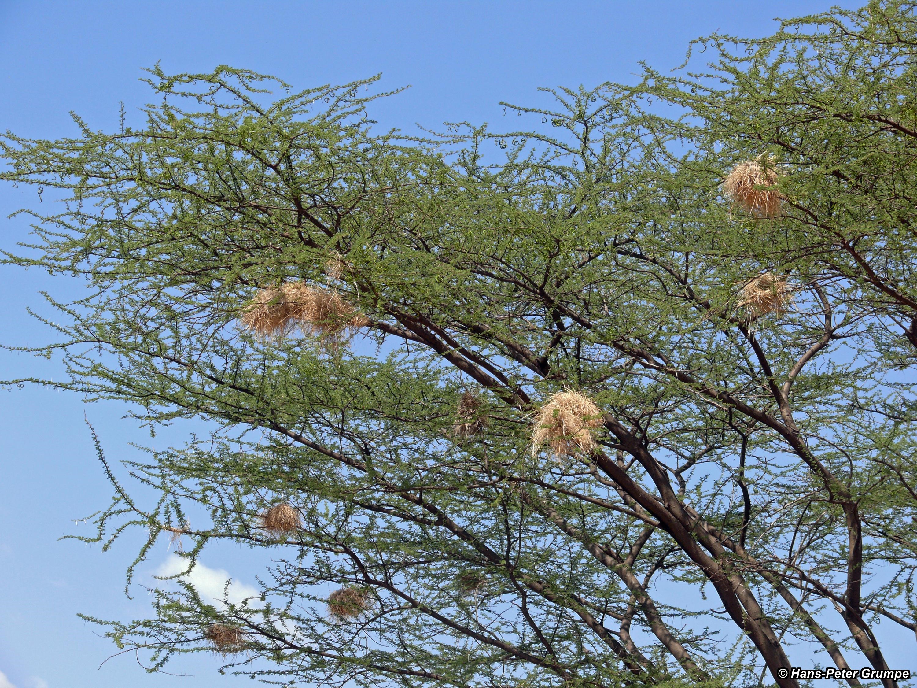 Rückweg vom Kara-Dorf: Schirmakazie, Nester von Webervögeln