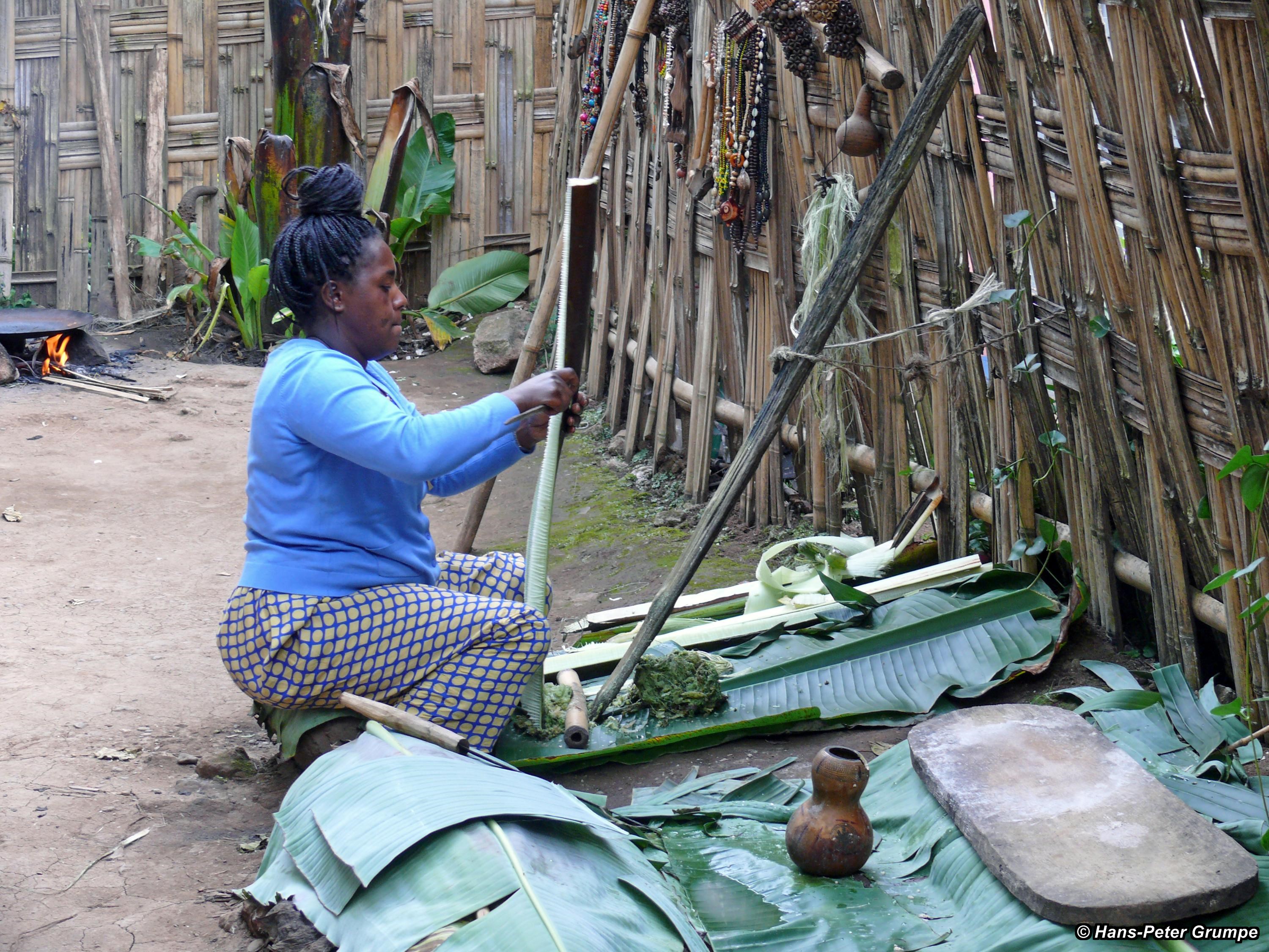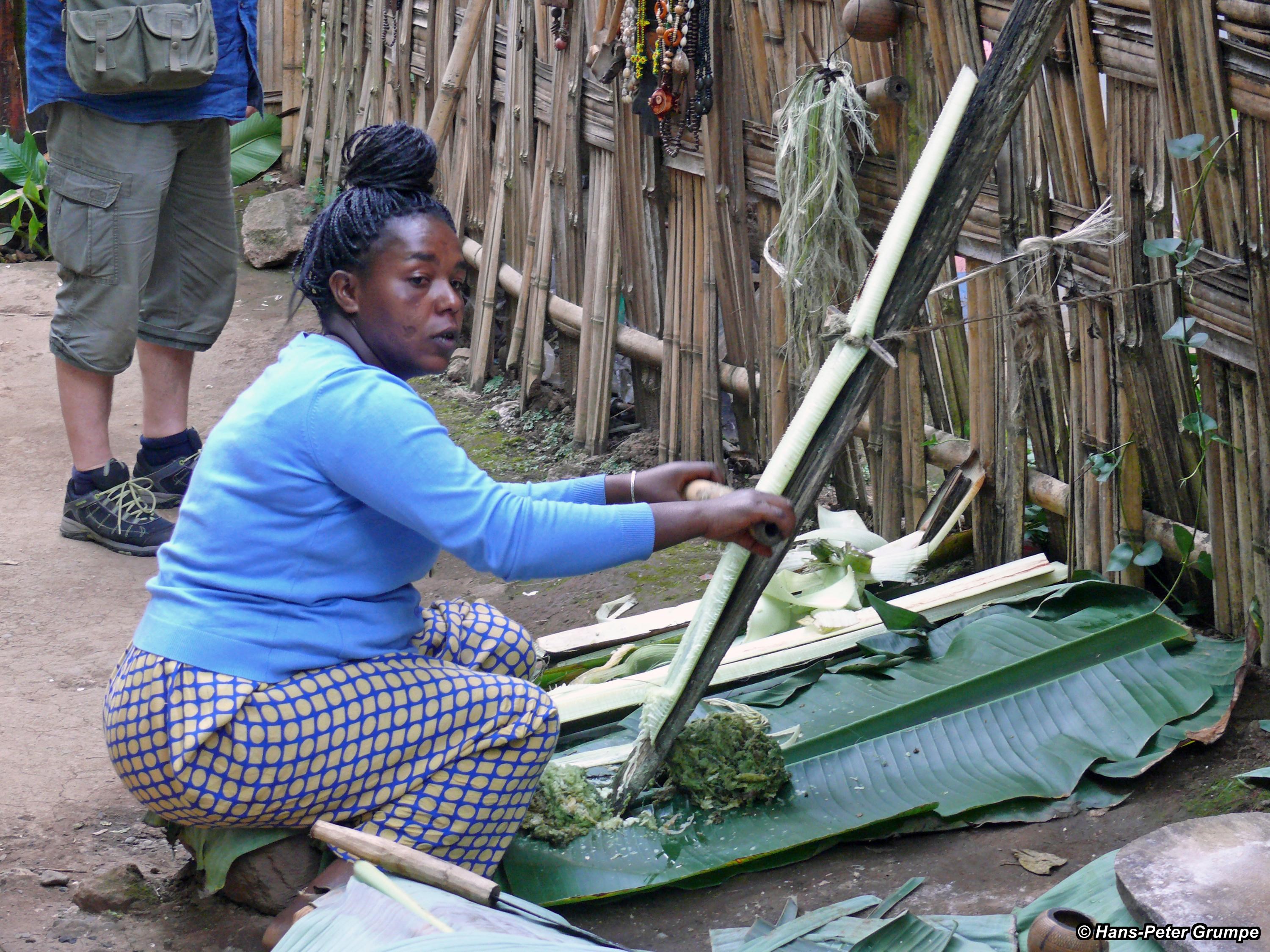 Dorze: Verarbeitung der 'Falschen Banane' - Aus den Fasern können feste Seile geflochten werden