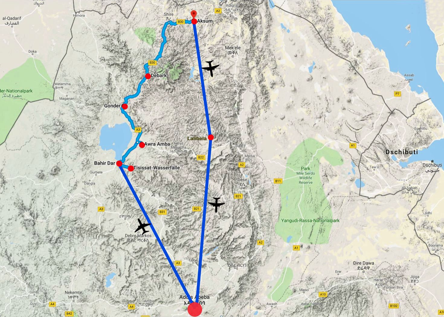 Start in Addis Abeba, Flug nach Bahir Dar, mit dem Bus zu den Tisissat-Wasserfällen des blauen Nils, über Awra Amba weiter nach Gondar, von Debark aus in die Simien-Berge, weiter nach Aksum, eine der früheren Hauptstädte, mit dem Flugzeug nach Lalibela mit den berühmten Felsenkirchen, Flug nach Addis Abeba