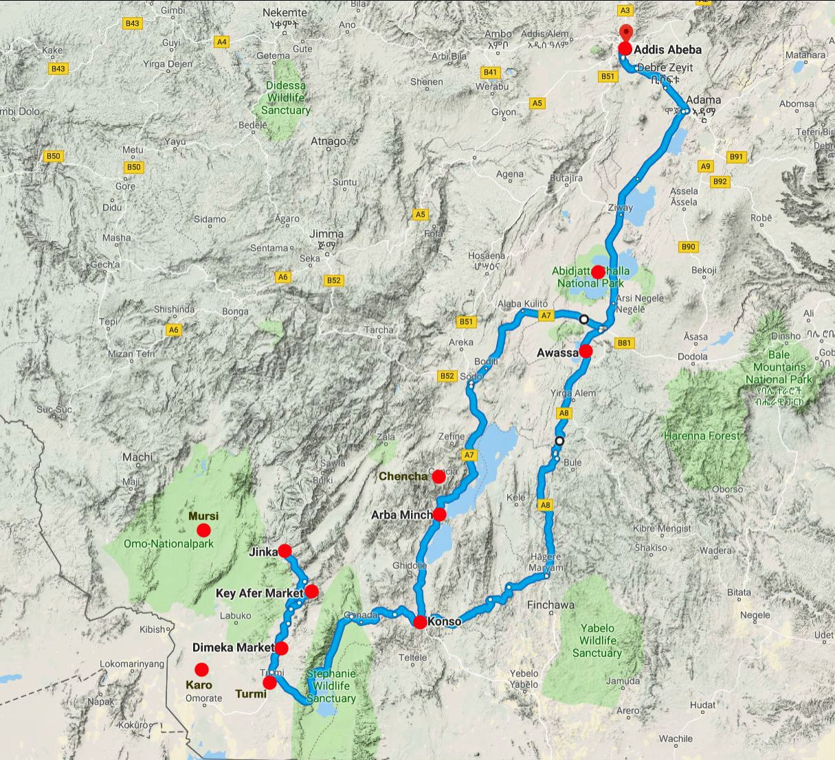 Mit Geländewagen (Toyota Landcruiser) von Addis Abeba nach Awassa, weiter nach Konso; von Konso zu den Märkten in Key Afer und Malle und bis Jinka; von dort Besuch eines Mursi-Dorfes; Weiterfahrt nach Turmi, unterwegs Besuch eines Ari-Dorfs und des Markts der Hamar in Dimeka; von Turmi Fahrt zu einem Karo-Dorf am Omo-River, zurück in Turmi Besuch einer Initiationsfeier der Hamar (Bullensprung) in der Nähe; am nächsten Tag über Konso (Marktbesuch) weiter nach Arba Minch, von dort Fahrt in die Berge nach Chencha, einem Dorf der Dorze und Bootsfahrt auf dem Chamo-See; Weiterfahrt nach Awassa, dann zum Abidjatta-Shalla-Nationalpark und zurück nach Addis Abeba.