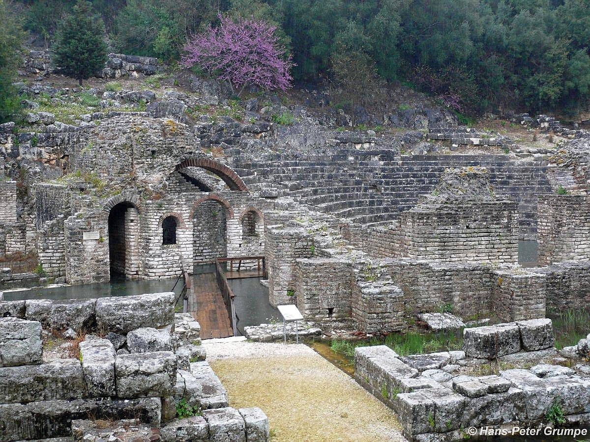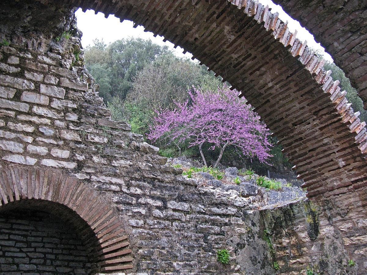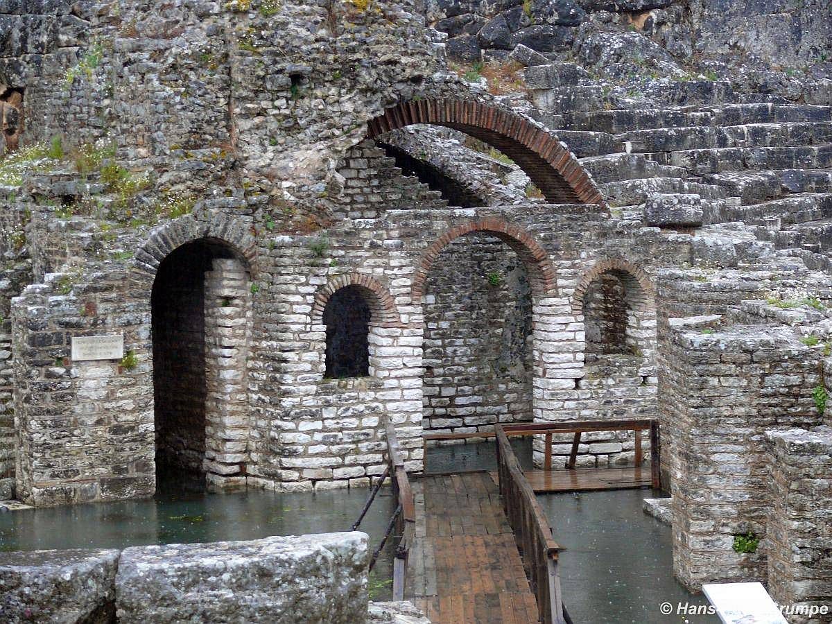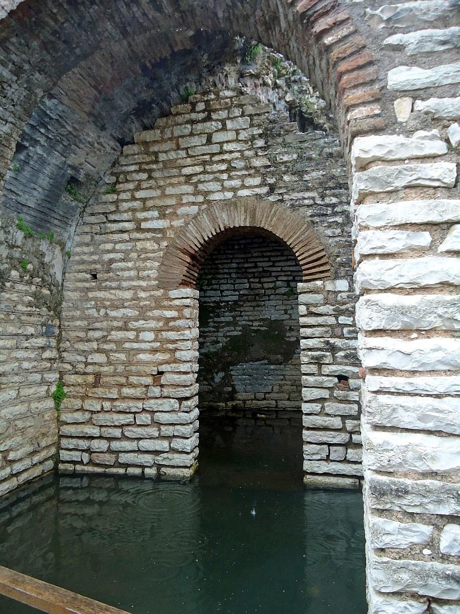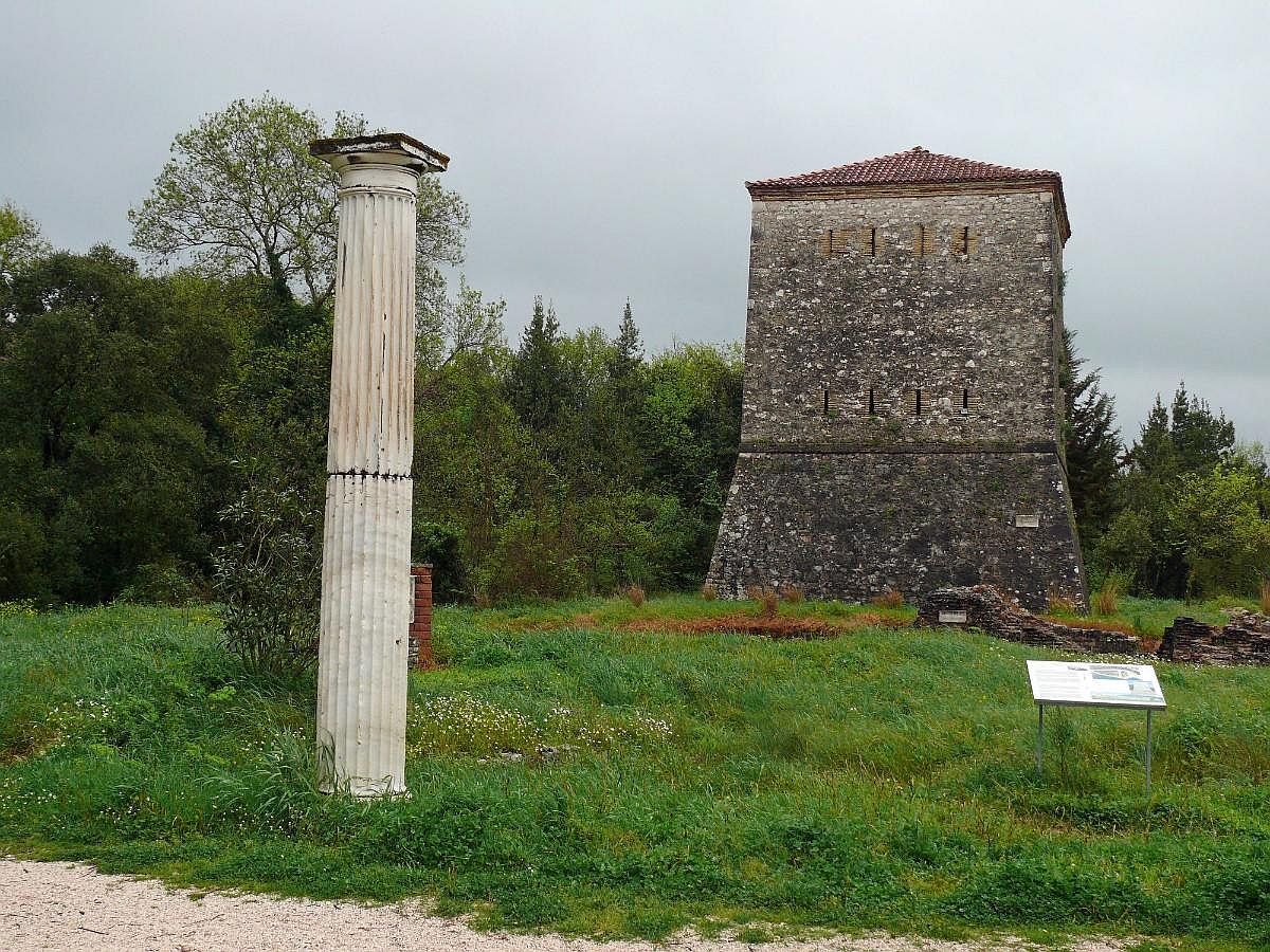 Eingang zum archäologischen Bereich: Venezianischer Turm, davor Ruinen eines Bades - © G. Weis