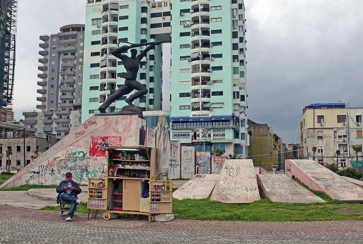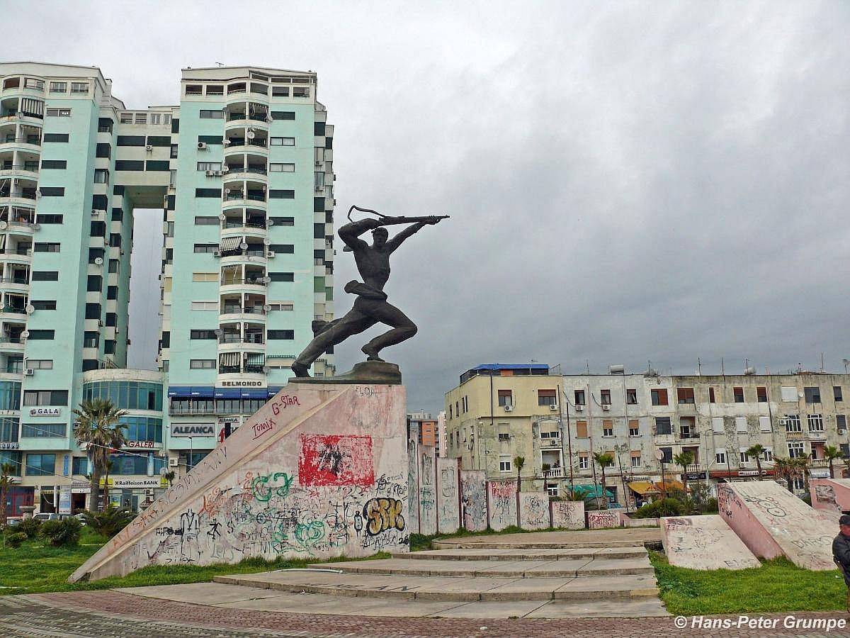 Durrės: Strandpromenade mit Relikten aus sozialistischer Zeit, Partisanendenkmal