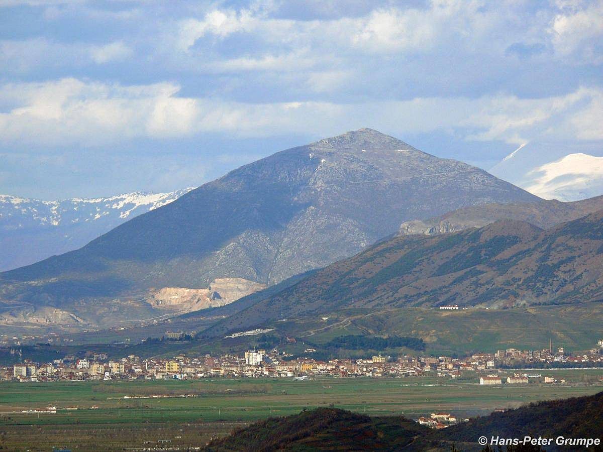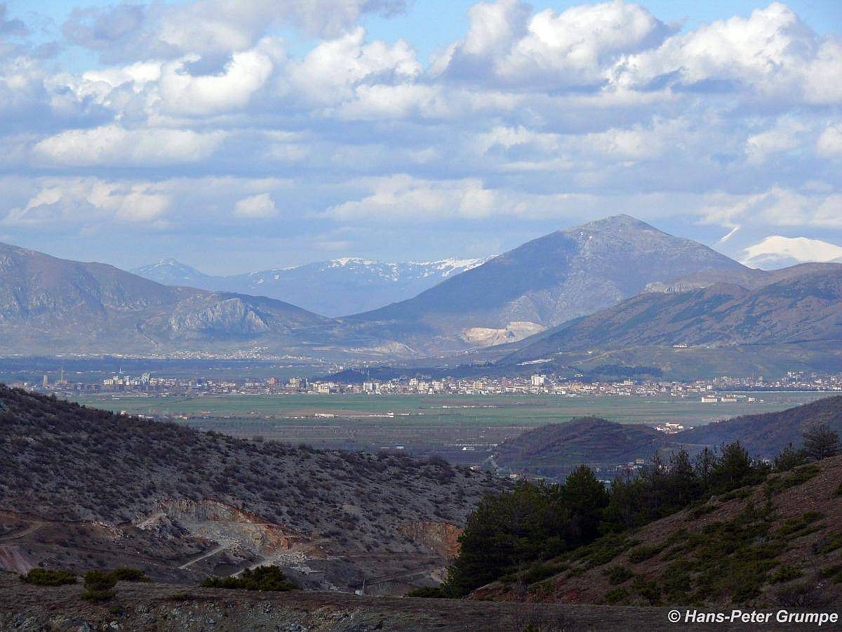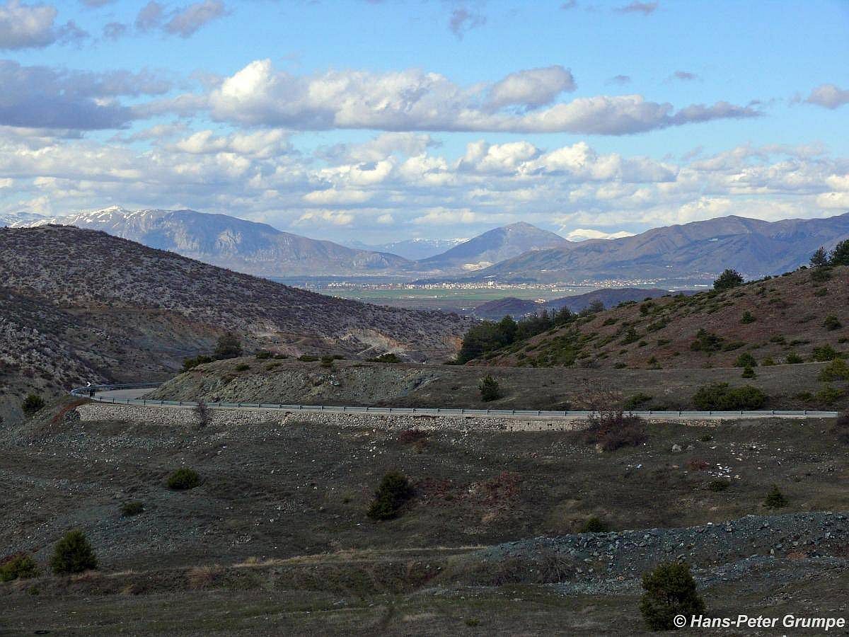 Zwischen Leskovik und Korça: Im Hintergrund die Hochebene von Korça (ca. 900m)