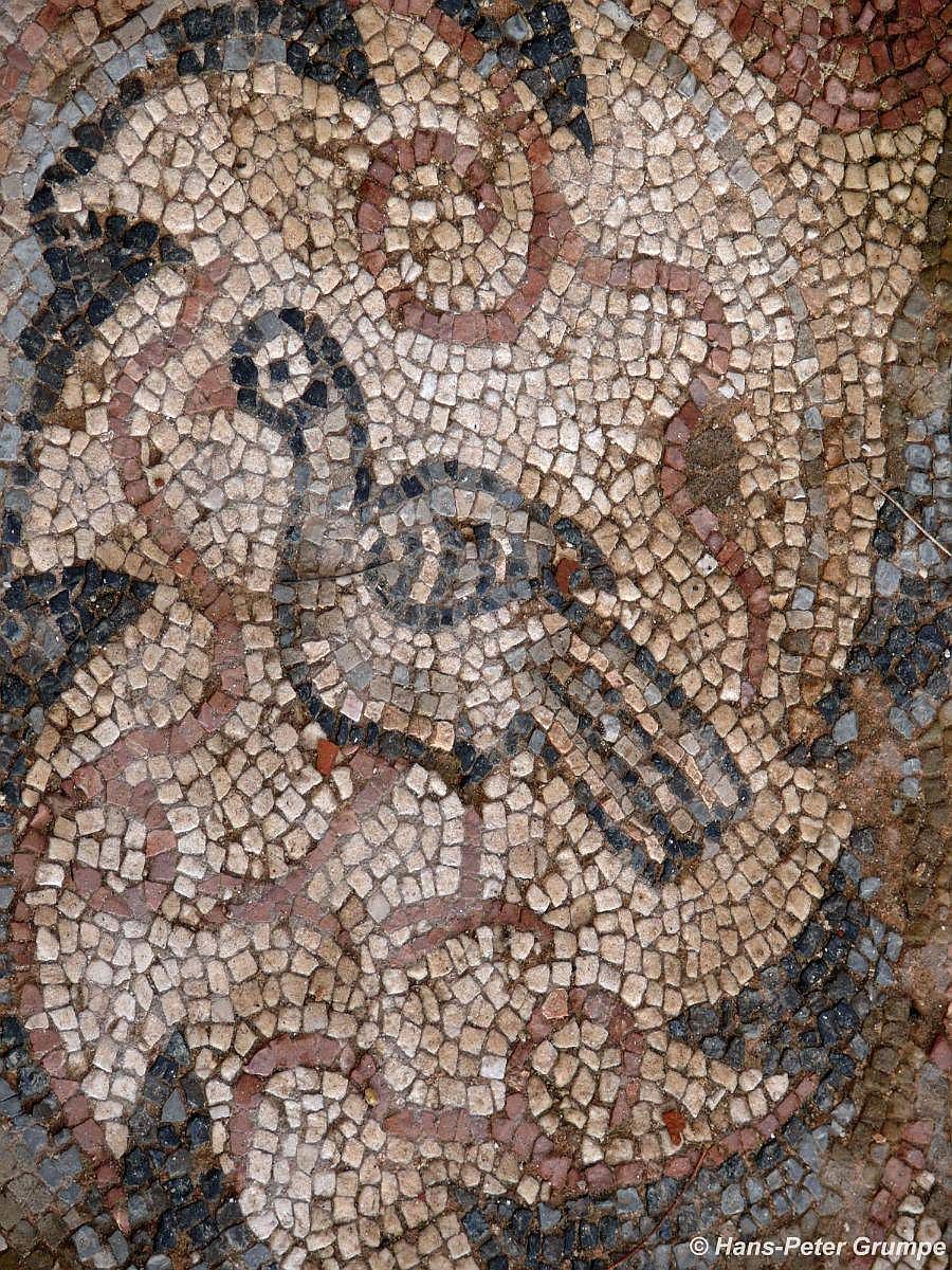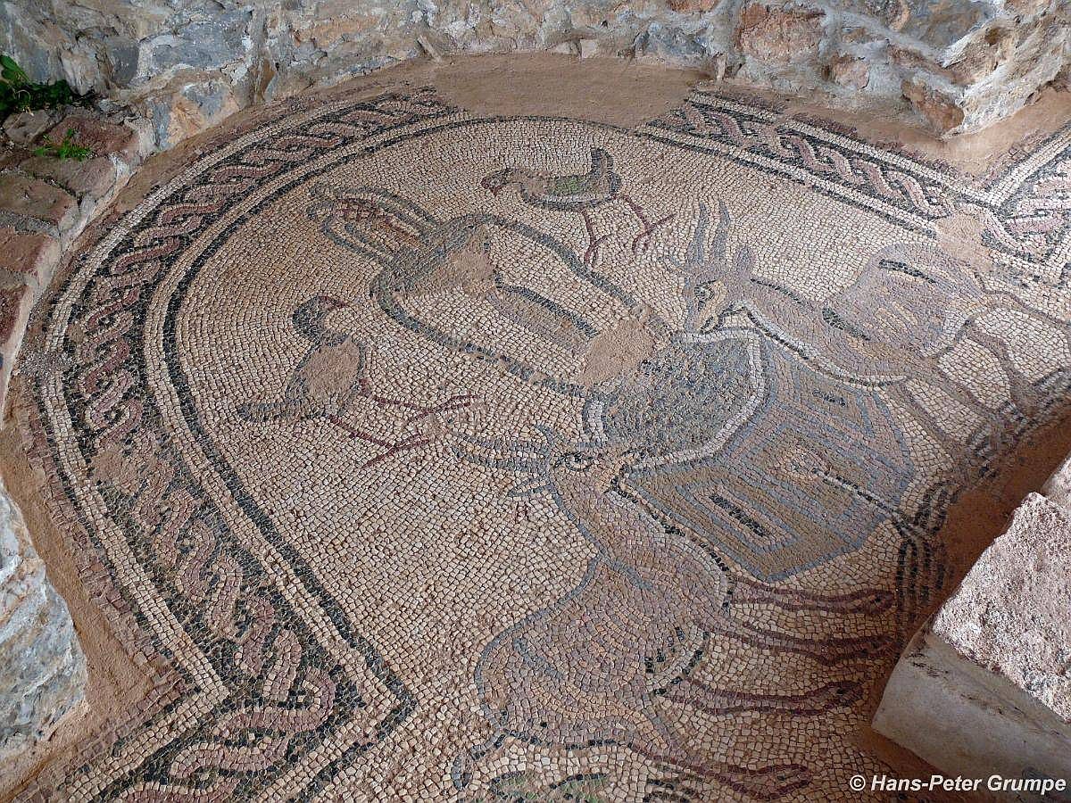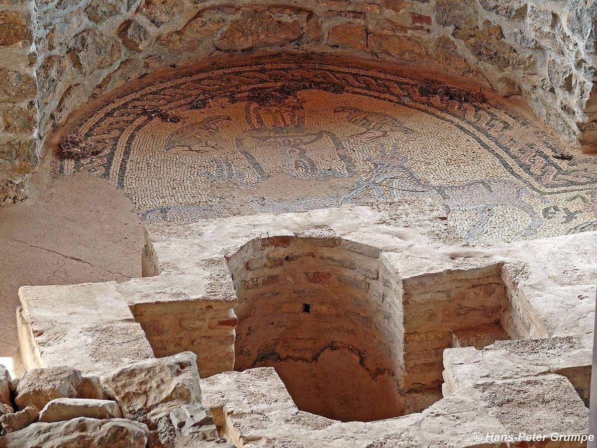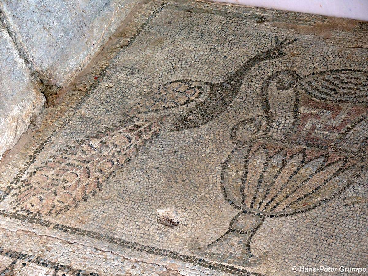 Ohrid: Reste der ehemaligen Kirche - Taufbecken, Mosaiken - Darstellung des Euphrat - © G. Weis