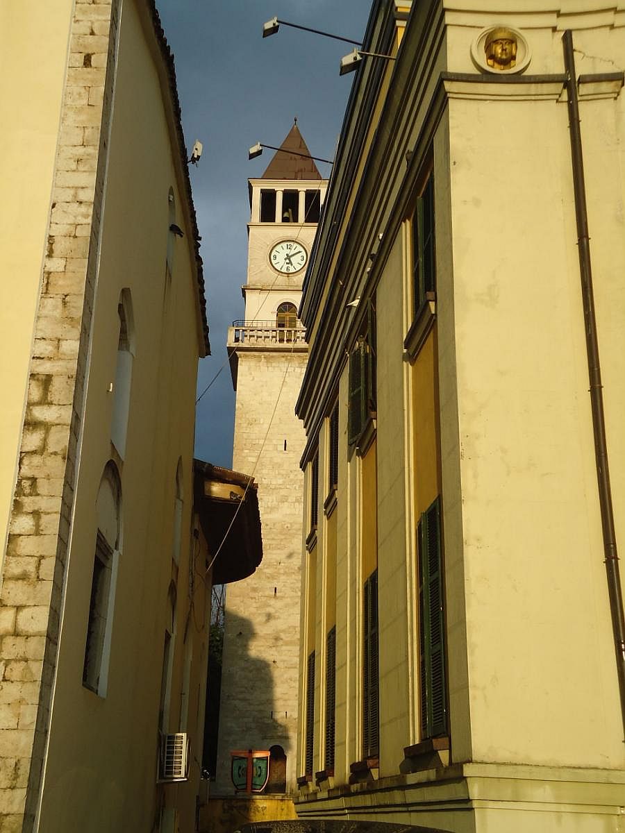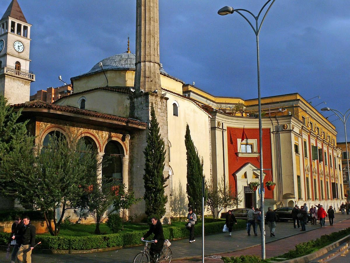 Kulturpalast links, rechts Et'hem-Bey-Moschee und Uhrturm