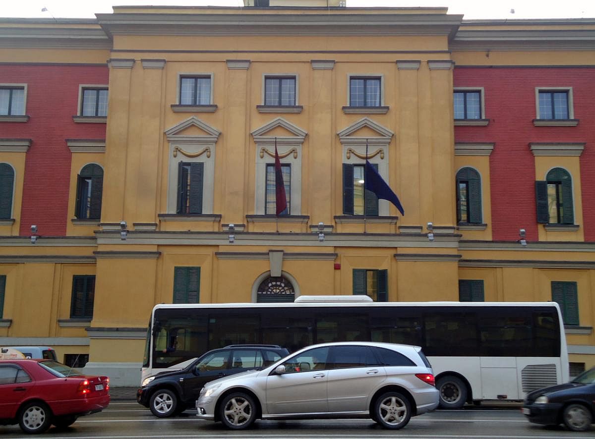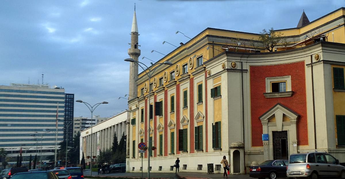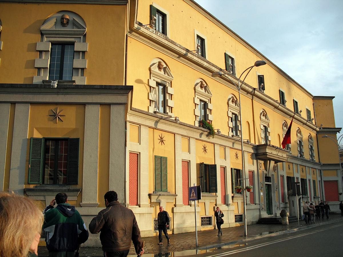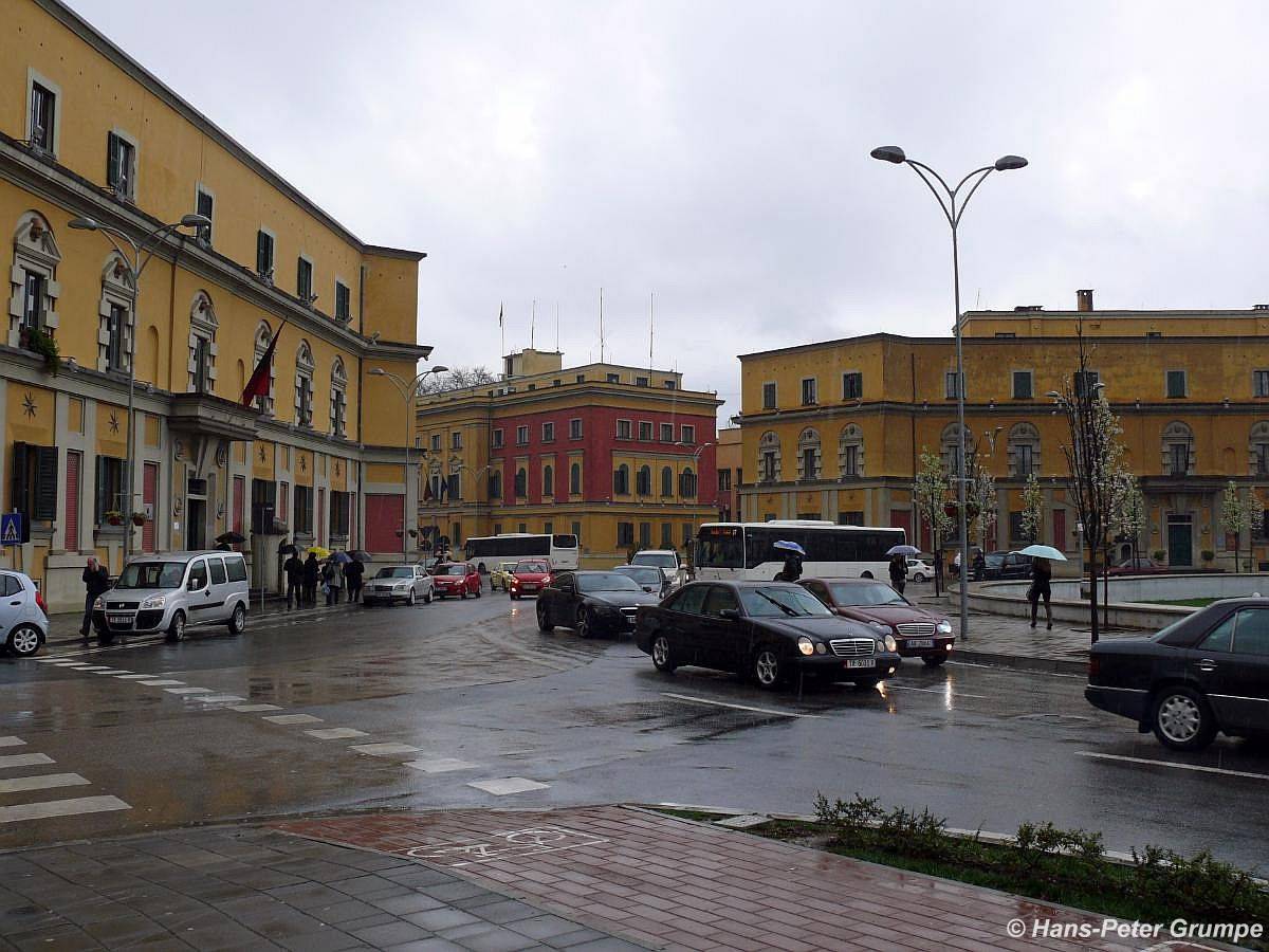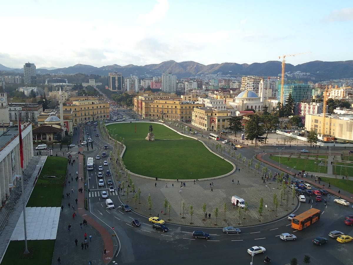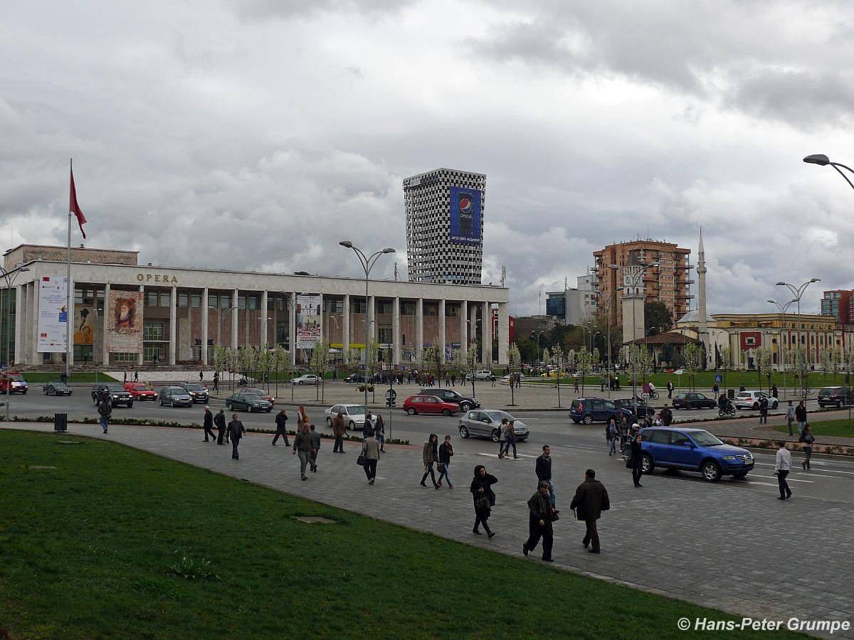 Von links: Tirana International Hotel, Kulturpalast, Minarett der Moschee, Teil des Gebäude-Ensembles aus der faschistischen Ära - © P.W. Herrmann