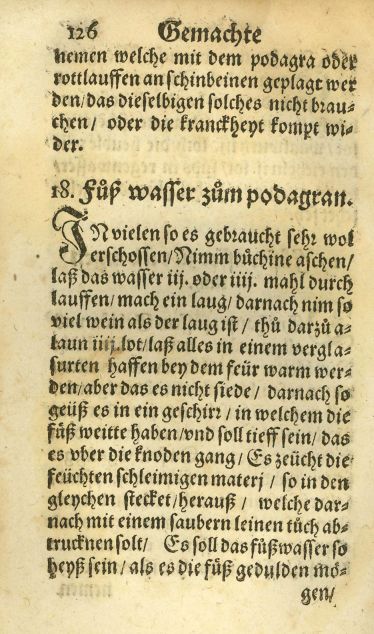 18. Fuß wasser zum podagran. In vielen so es gebraucht sehr wol erschossen / Nimm buechine aschen / laß das wasser 3 oder 4 mahl durch lauffen / mach ein laug / darnach nim so viel wein als der laug ist / thu darzu alaun 4 lot / laß alles in einem verglasurten haffen bey dem feür warm werden / aber das es nicht siede / darnach so geüß es in ein geschirr / in welchem die fueß weitte haben / und soll tieff sein / das es uber die knoden gang / Es zeücht die feüchten schleimigen materi / so in den gleychen stecket / herauß / welche darnach mit einem saubern leinen tuch abtrucknen solt / Es soll das fußwasser so heys sein / als es die fueß gedulden moe= gen |