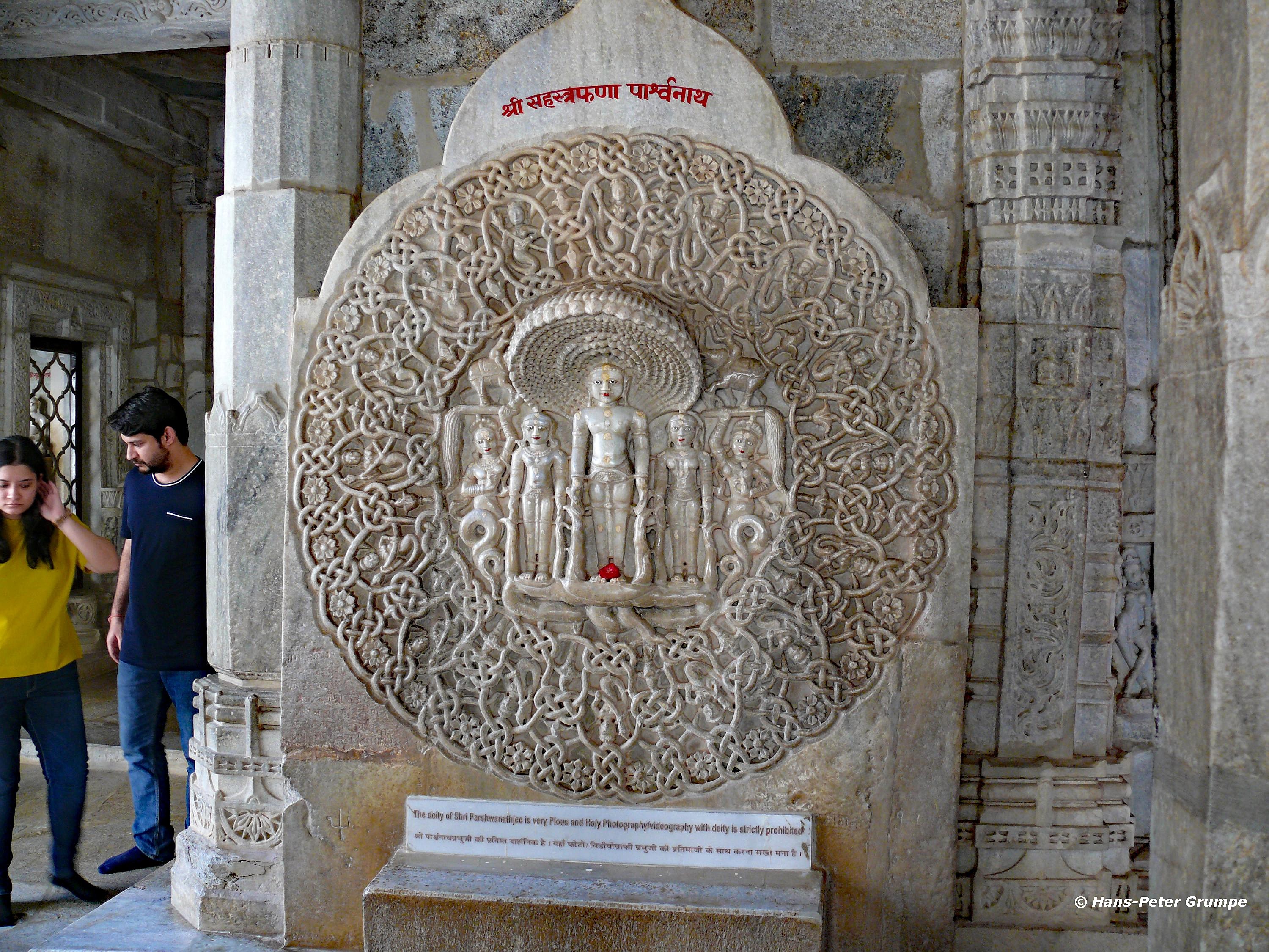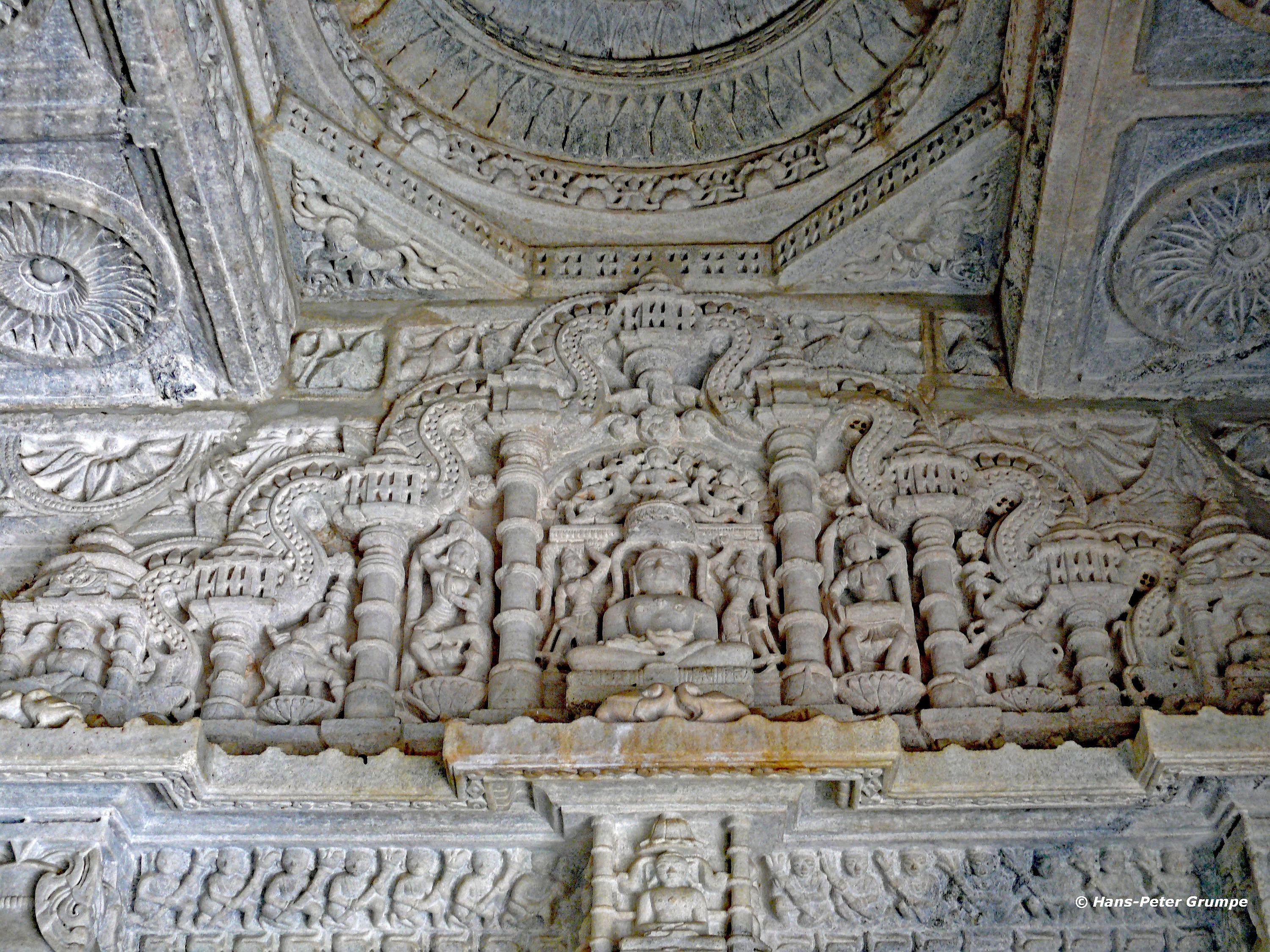 Ranakpur: Adinatha-Tempel - Parshvanata in Medaillon, vom tausendköpfigen Schlangengott Dharanendra gegen einen mächtigen Sturm beschützt, den der Titan Meghamalin entfesselt hatte