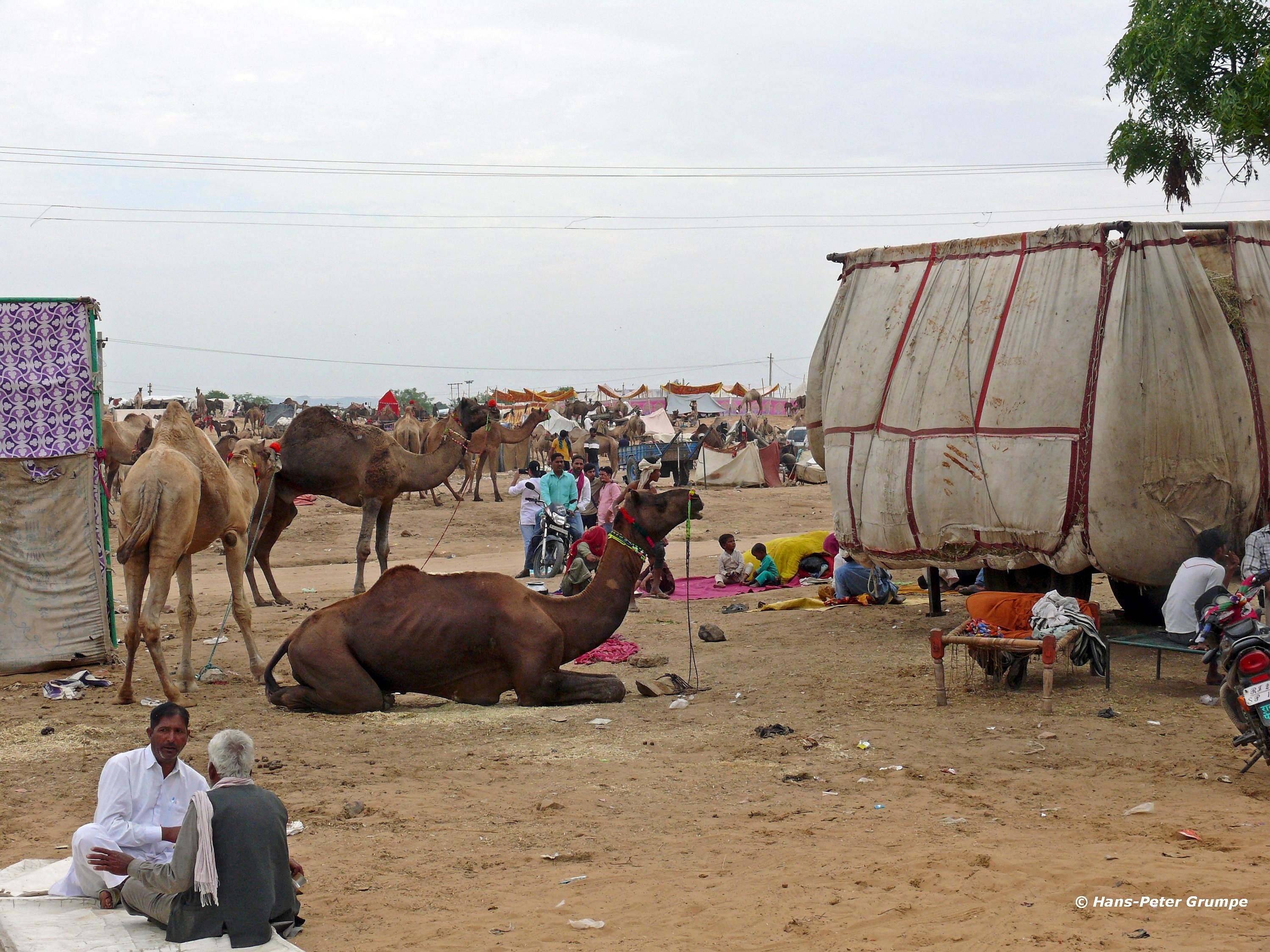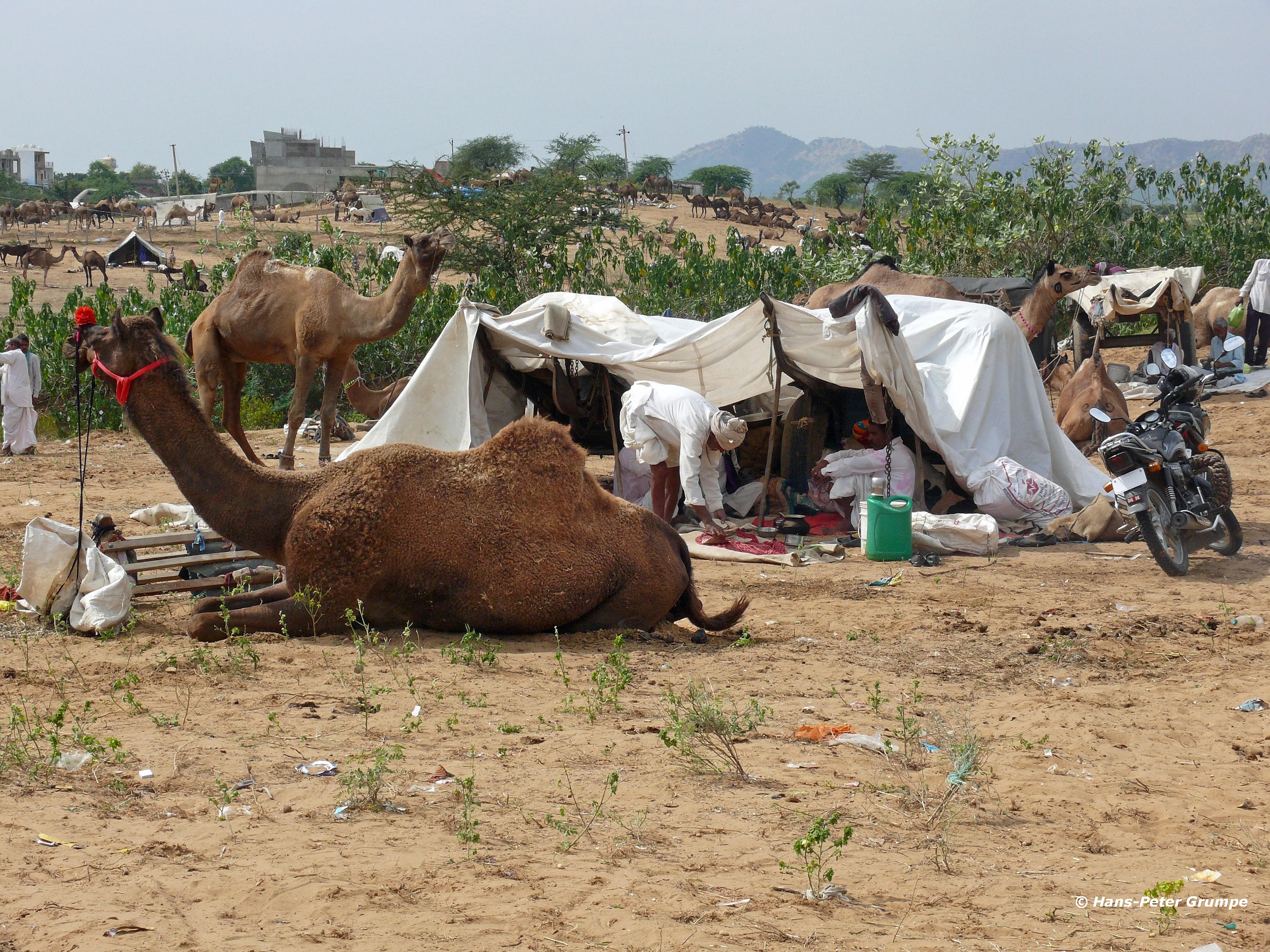 Pushkar Mela: Pferde- und Kamelmarkt - ruhendes Kamel, Händlerzelt