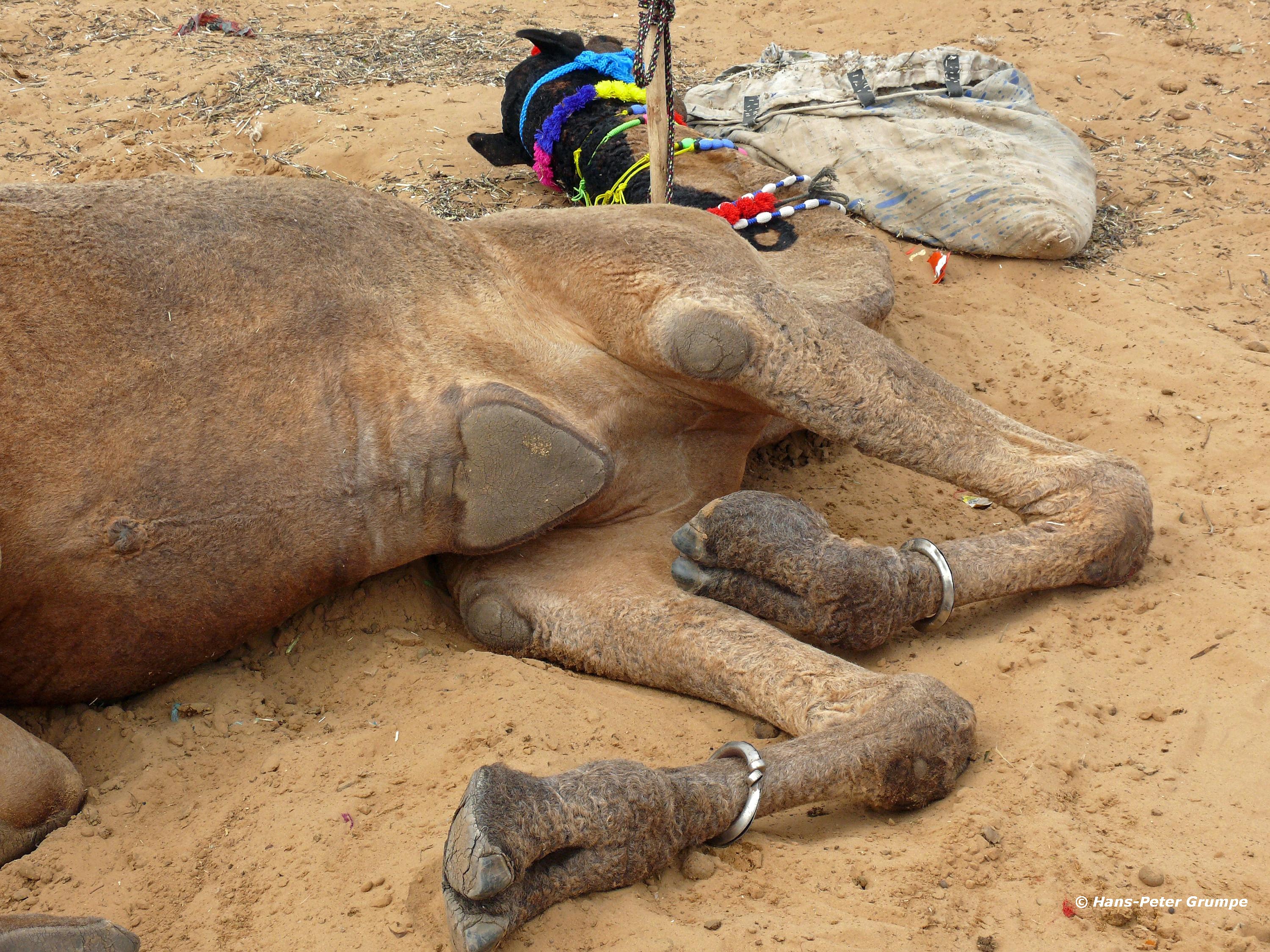 Pushkar Mela: Pferde- und Kamelmarkt - liegendes Kamel, Hornschwielen u.a. an der Brust