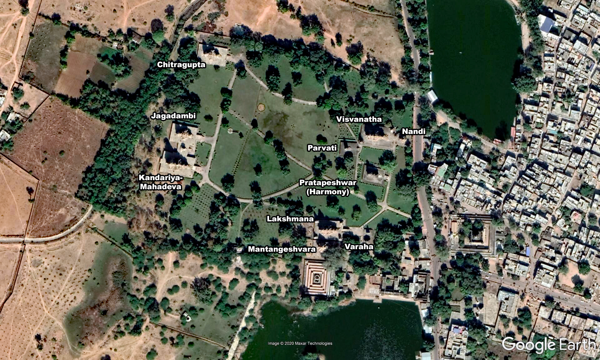 Matangeshvara-Tempel (ca. 950), Varaha-Tempel (ca. 950), Lakshmana-Tempel (ca. 950), Devi-Tempel, Vishvanatha-Tempel (ca. 1000), Nandi-Schrein, Parvati-Schrein, Jagadambi-Tempel, Chitragupta-Tempel, Kandariya-Mahadeva-Tempel (1. Hälfte 11. Jhdt.)