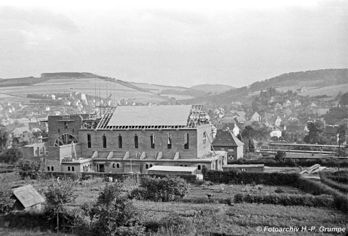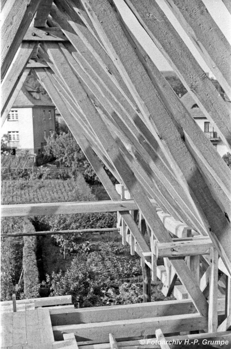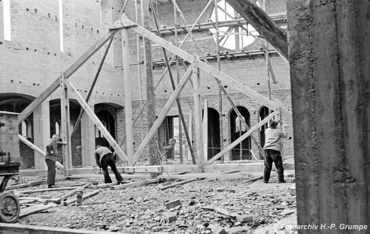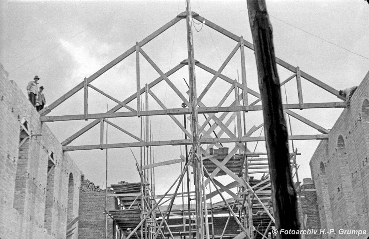 Die einzelnen Teile des Dachstuhls wurden zusammengesetzt und durch das Kircheninnere mit einfachen Flaschenzügen nach oben gehievt. Ein Kran wurde nicht verwendet. Für die Zimmerarbeiten war die Firma Theodor Wiese verantwortlich, die Dachdeckerarbeiten erledigten Hermann Hirth und Alois Schneider.