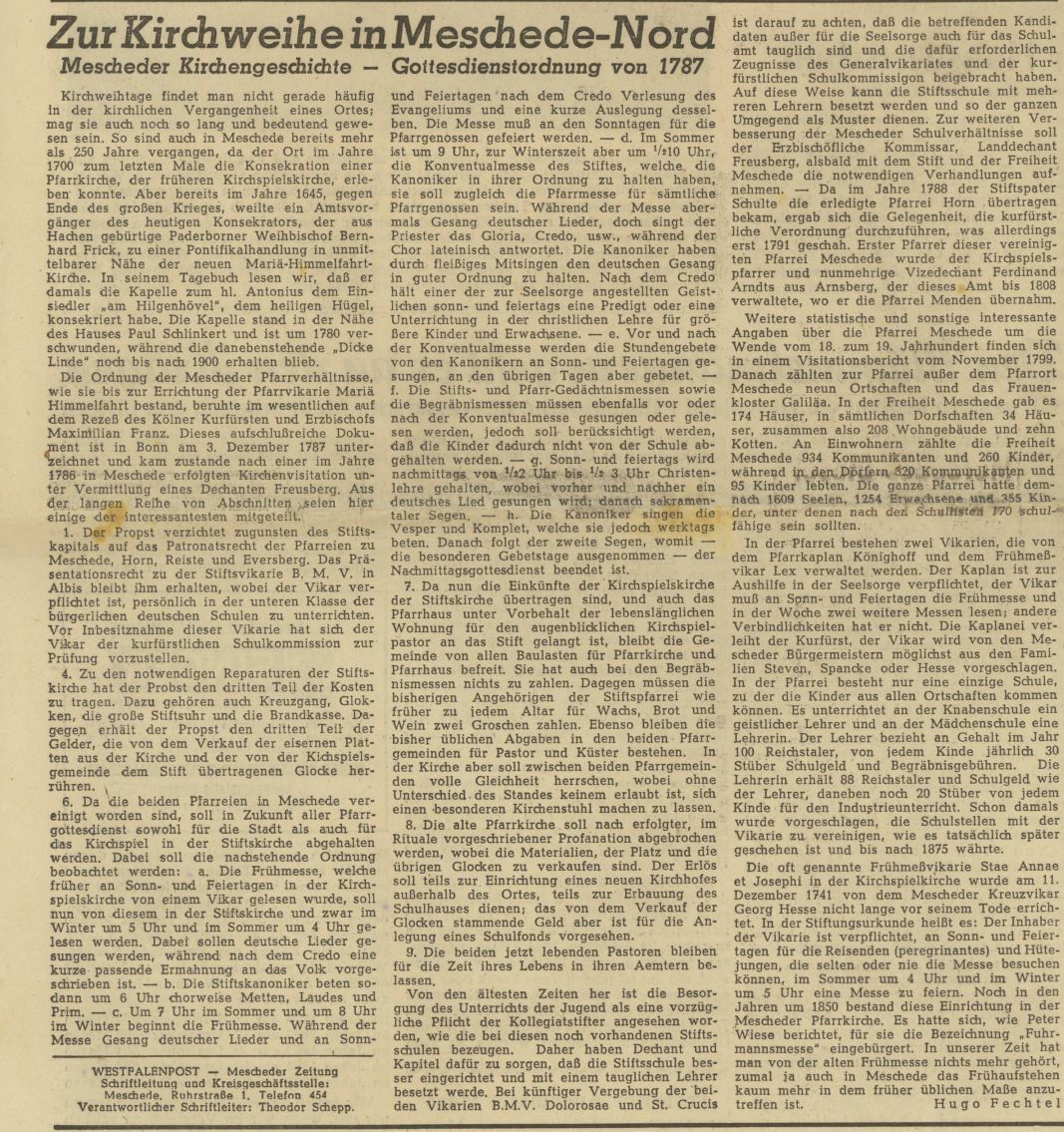 - Westfalenpost vom 17.10.1953: Zur Kirchweihe in Meschede-Nord - Mescheder Kirchengeschichte - Gottesdienstordnung von 1787 (Hugo Fechtel)