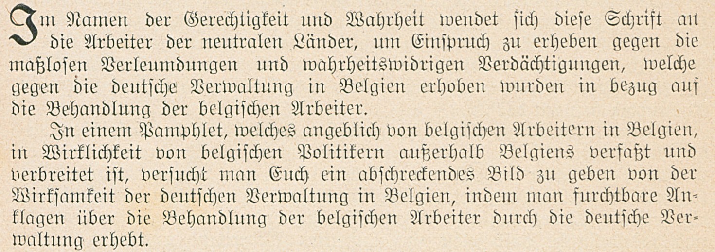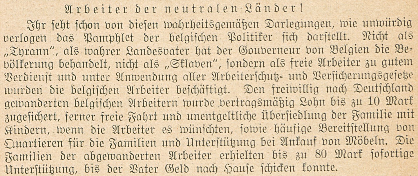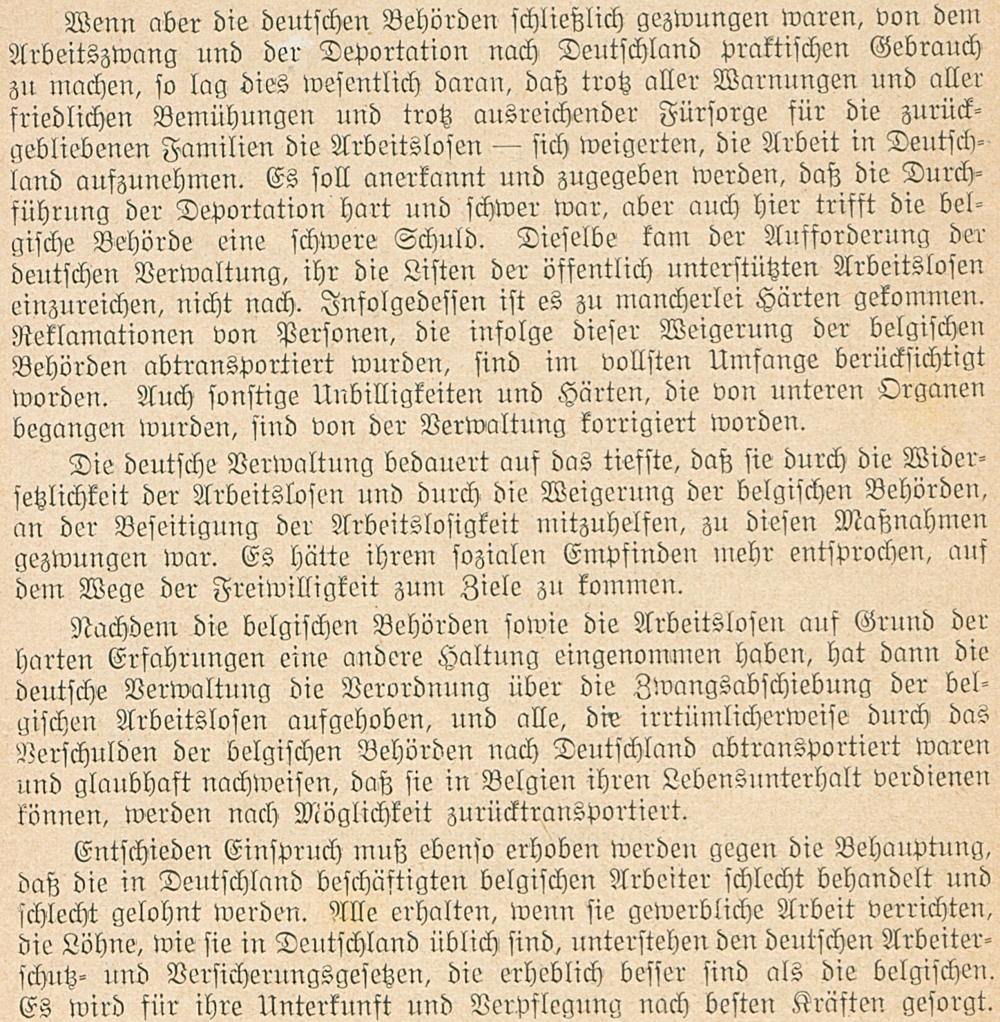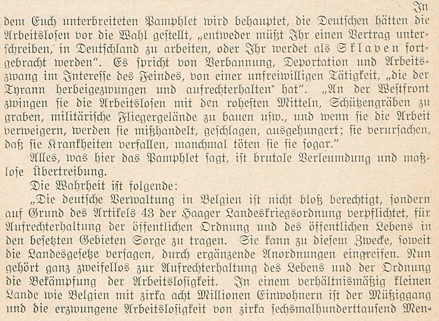 Mit diesem Pamphlet von 1917 - kein Verfasser wird genannt - versuchte man, die Zwangsarbeit belgischer Zivilarbeiter zu rechtfertigen und zu beschönigen und jegliche Kritik und Widerstand als Verleumdungen abzutun. |