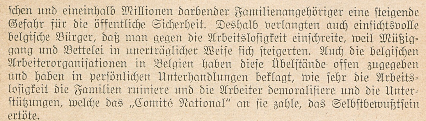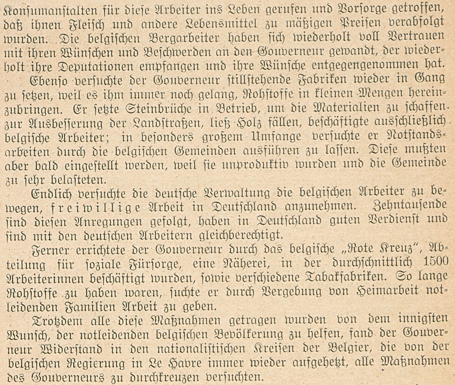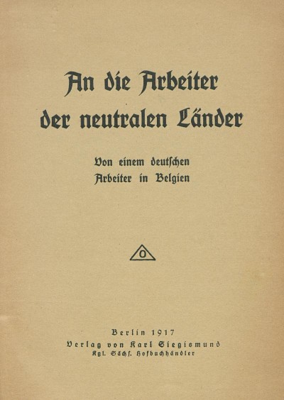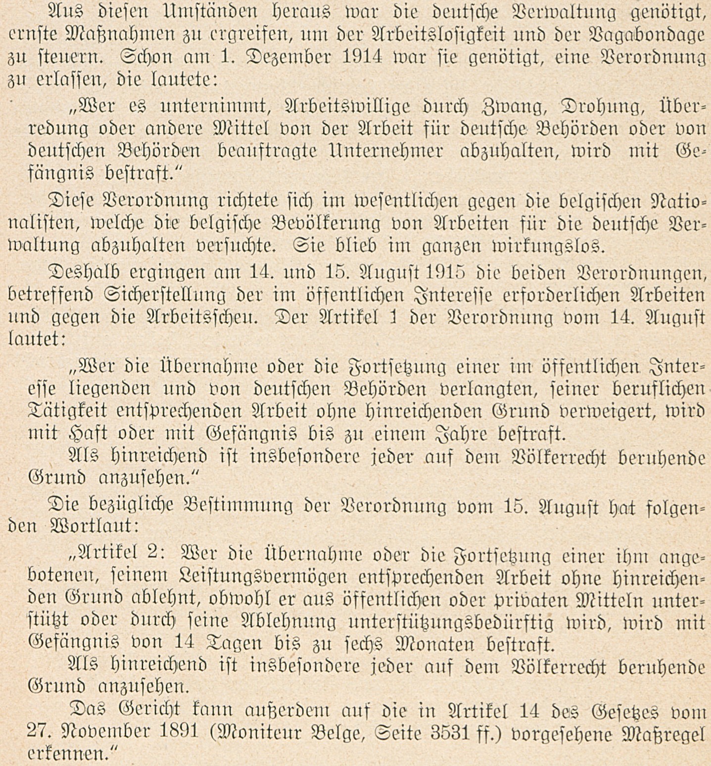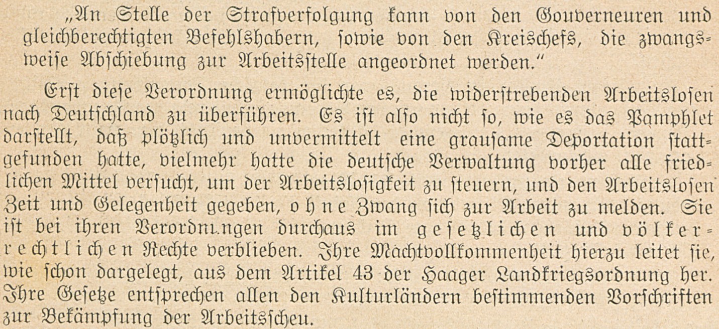 Mit diesem Pamphlet von 1917 - kein Verfasser wird genannt - versuchte man, die Zwangsarbeit belgischer Zivilarbeiter zu rechtfertigen und zu beschönigen und jegliche Kritik und Widerstand als Verleumdungen abzutun. |