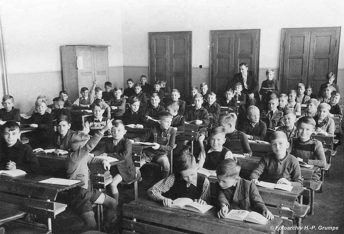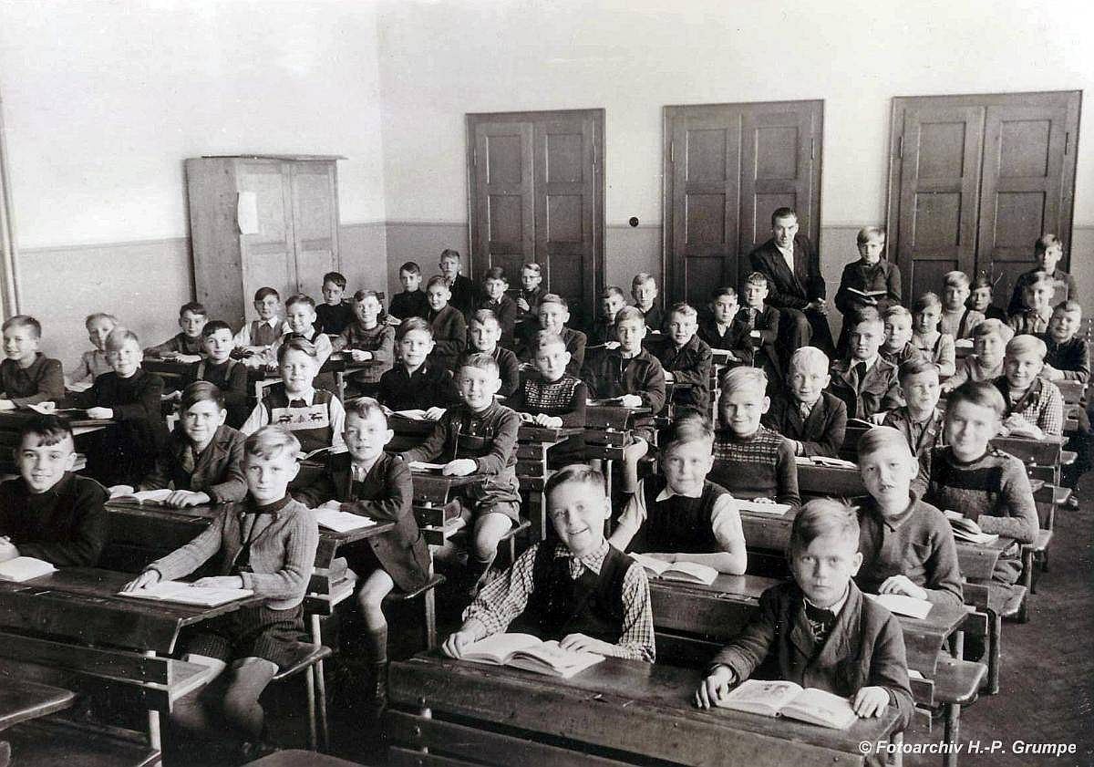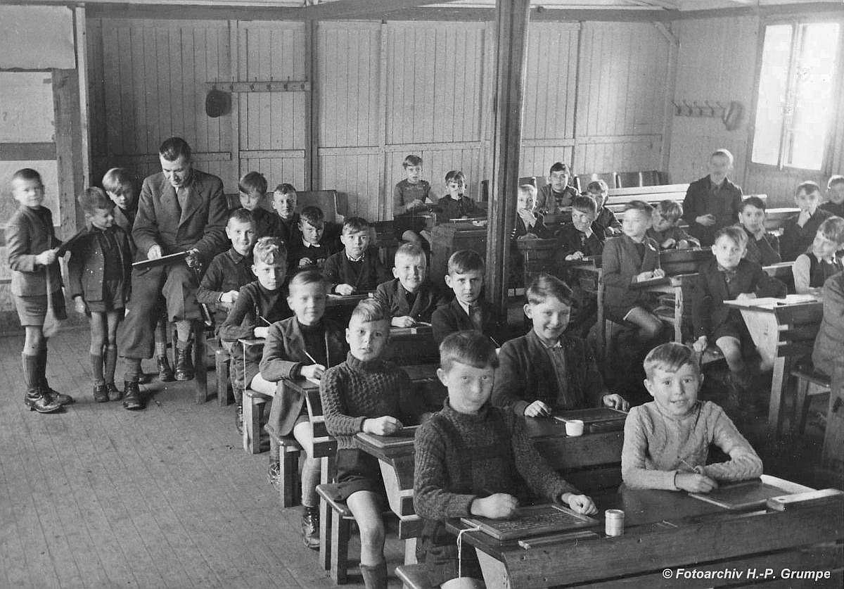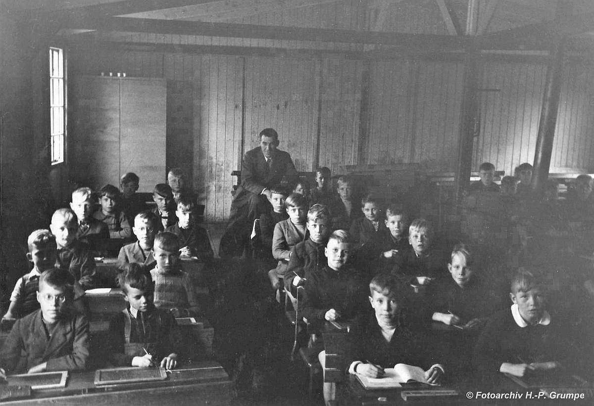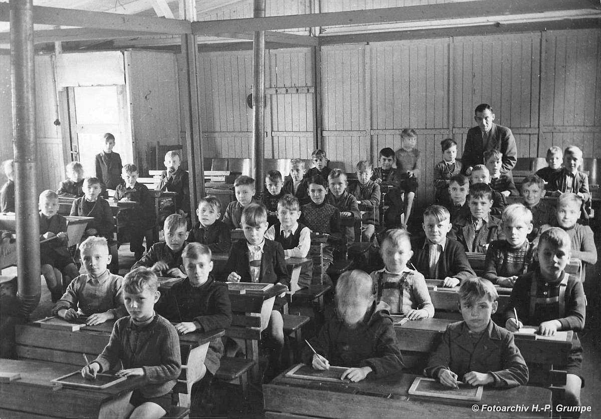 "....Die katholische Volksschule fristete zunächst in den Baracken im Gelände des Schützenhofes ein wahrhaft kümmerliches Dasein. Die äußerst dürftigen »Klassenräume« waren überfüllt; es gab zunächst weder Tafeln noch Griffel, weder Hefte noch Schulbücher. Täglich erhielten alle Kinder eine warme »Schulspeisung«. Erst am 6.Dezember 1948 konnte die Schule wieder in das renovierte Gebäude an der Steinstraße verlegt werden....."