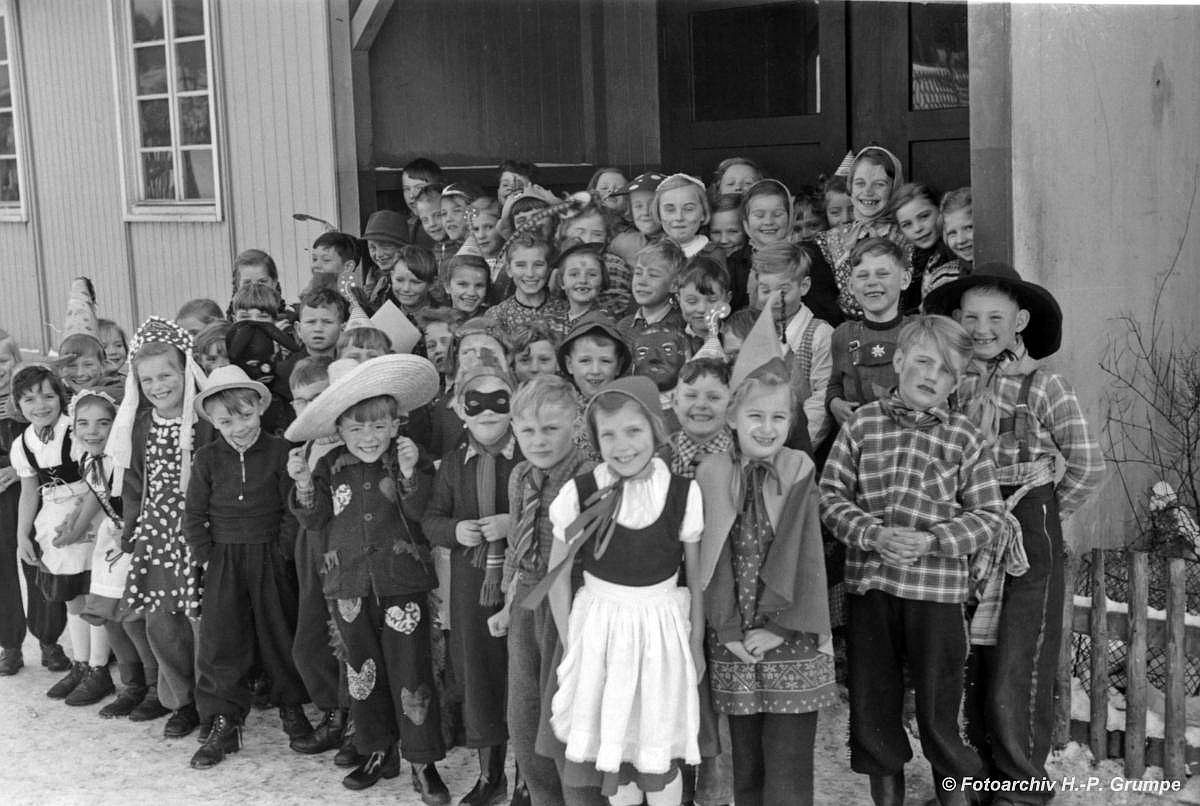 1955 Fastnacht, vor der Schulbaracke