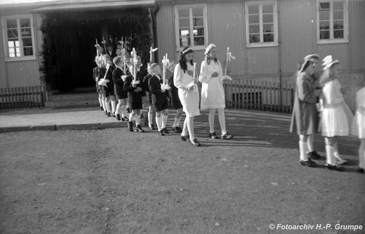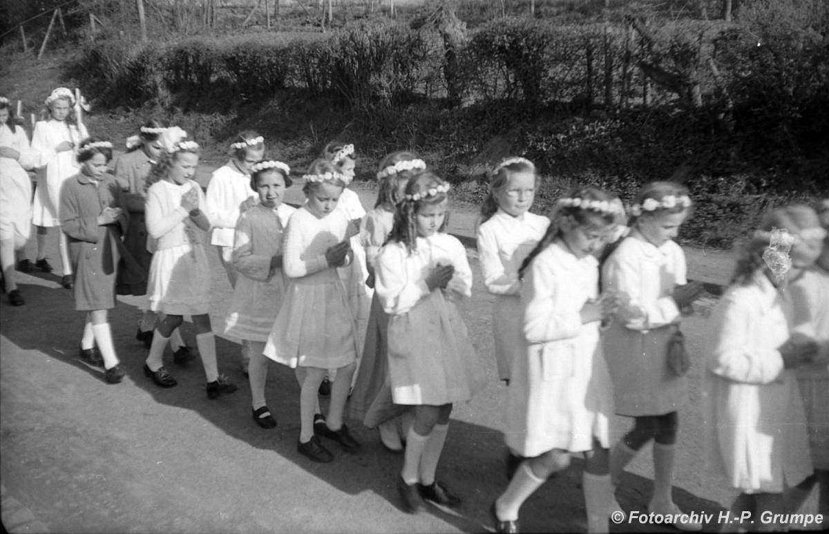 Letzte Erstkommunion in der Notkirche am 12.4.1953: Abmarsch von der Schule
