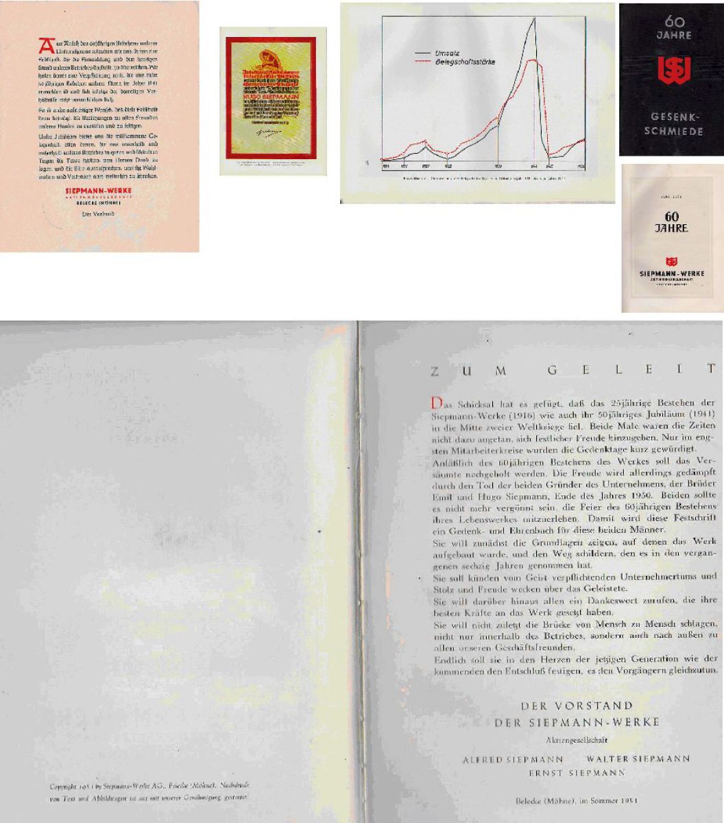 Diese „Ehrenurkunde“ mit der Unterschrift „Die Ehrenurkunde mit der Ernennung Hugo Siepmanns zum Ehrenpräsidenten der Industrie- und Handelskammer anläßlich seines 70. Geburtstages“ wird stolz abgedruckt in dem Buch „60 Jahre Gesenkschmiede“ bzw. „1891-1951. 60 Jahre Siepmann-Werke, Aktiengesellschaft Belecke-Möhne“, einer Festschrift von 1951, das auch zum Erbe meiner Mutter gehört. Ich fand es zwischen ihren Büchern.