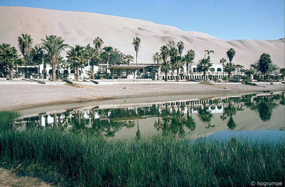 malerisch die Oase Huacachina inmitten riesiger Sanddünen. Um einen kleinen