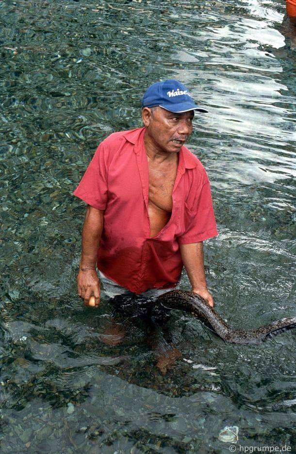 Der Pool wird zum Schwimmen und Waschen genutzt, die großen Aale schwimmen