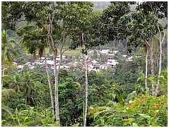 Mit Ojeks (Motorradtaxis) ging es dann 20 Minuten über teilweise asphaltierte, aber sehr löchrige und holprige Pisten zu seinem Dorf Ohoilin. Wir wurden freundlich in seinem Elternhaus empfangen und bewirtet. Max zeigte uns sein Dorf, wir bestiegen mit ihm den "Kalvarienberg", den höchsten Berg in der Umgebung, gesäumt von Kreuzwegstationen, und von oben bot sich eine atemberaubende Aussicht auf beide Seiten der Insel. Die Orte an der Ostküste sind während des SO-Monsuns nicht mit dem Boot zu erreichen, die Brandung ist zu stark. "Du bist vermutlich erst der zweite Europäer, der den Berg bestiegen hat. Der erste war der Bischof von Ambon (ein Holländer)" sagte Max.