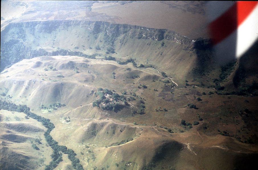 Beim Anflug: Der östliche Teil Sumbas ist sehr trocken, hat z.T. Steppencharakter. Nur die Flusstäler haben Baumbestand. An der Küste sind sehr schön Mangroven zu erkennen. | ![]() |