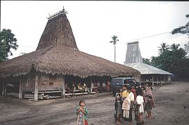 Häuser Ost-Sumbas mit dem hochgezogenen Dach (= Sitz der Geister und Ahnen),