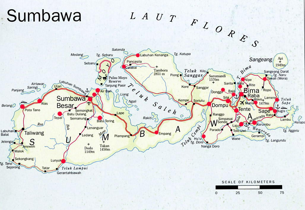 Einführung:Sumbawa, die Nachbarinsel von Lombok, ist vom Massentourismus verschont geblieben. Meist durchqueren Touristen die Insel nur, um weiter nach Komodo zu kommen. Ähnlich machte ich es 1998, allerdings in Ost-West Richtung. In 4 Tagen bekam ich erste Eindrücke. Im Jahr 2001 entschied ich mich, von Lombok aus Sumbawa mit meinem Freund und Guide Syarif zu erkunden. Mit dem Auto fuhren wir quer durch Lombok, setzten von Labuhan Lombok mit der Fähre nach Poto Tano über und blieben in Sumbawa ca. 14 Tage. Mit über 15 000 km2 ist die Insel größer als Bali und Lombok zusammen. |