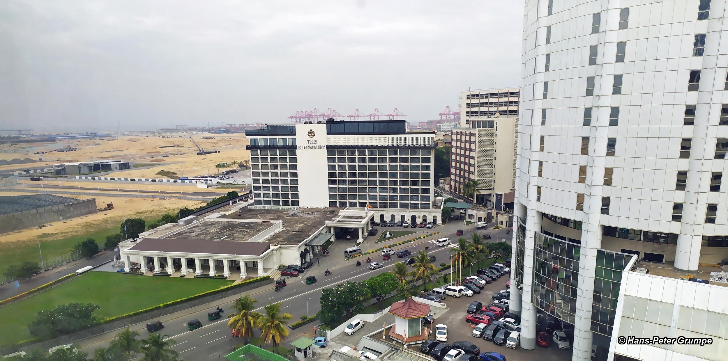 ![]() Colombo: Blick aus dem Fenster des Galadari Hotels auf die Aufschüttungen der neuen 'Colombo Port City' (CPC), eine Stadt in der Stadt für 80.000 Einwohner. Bis 2040 soll die neue Stadt fertig sein. Hauptinvestor ist China ('Neue Seidenstraße'). |