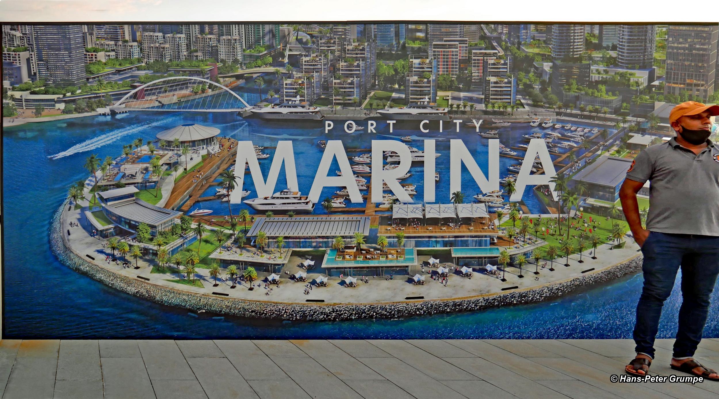![]() Colombo: So soll die projektierte neue Stadt 'Colombo Port City' einmal aussehen, bisher existiert die Marina und die Brücke (rechts unten). |