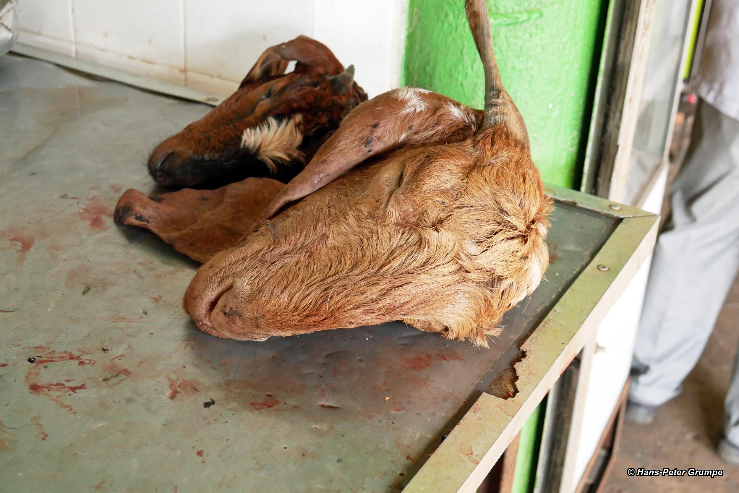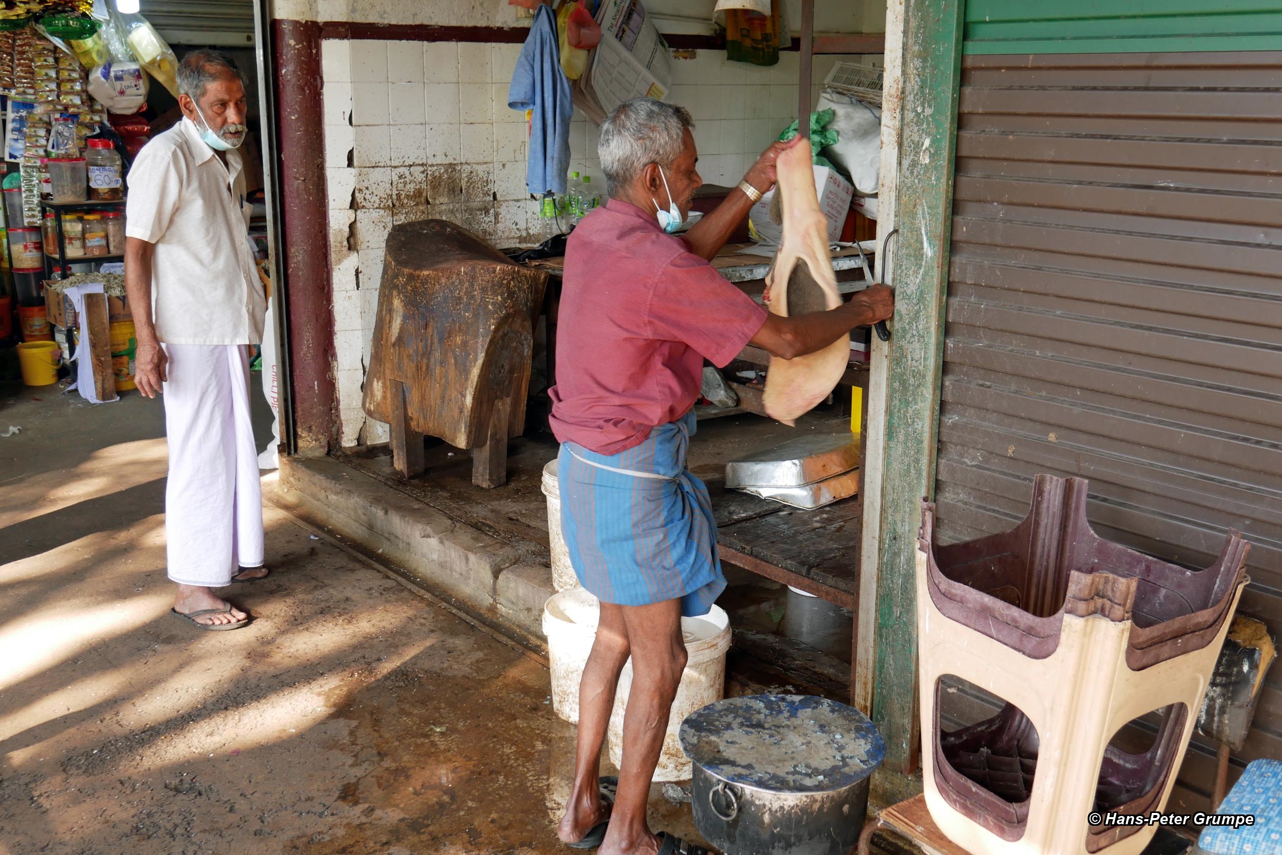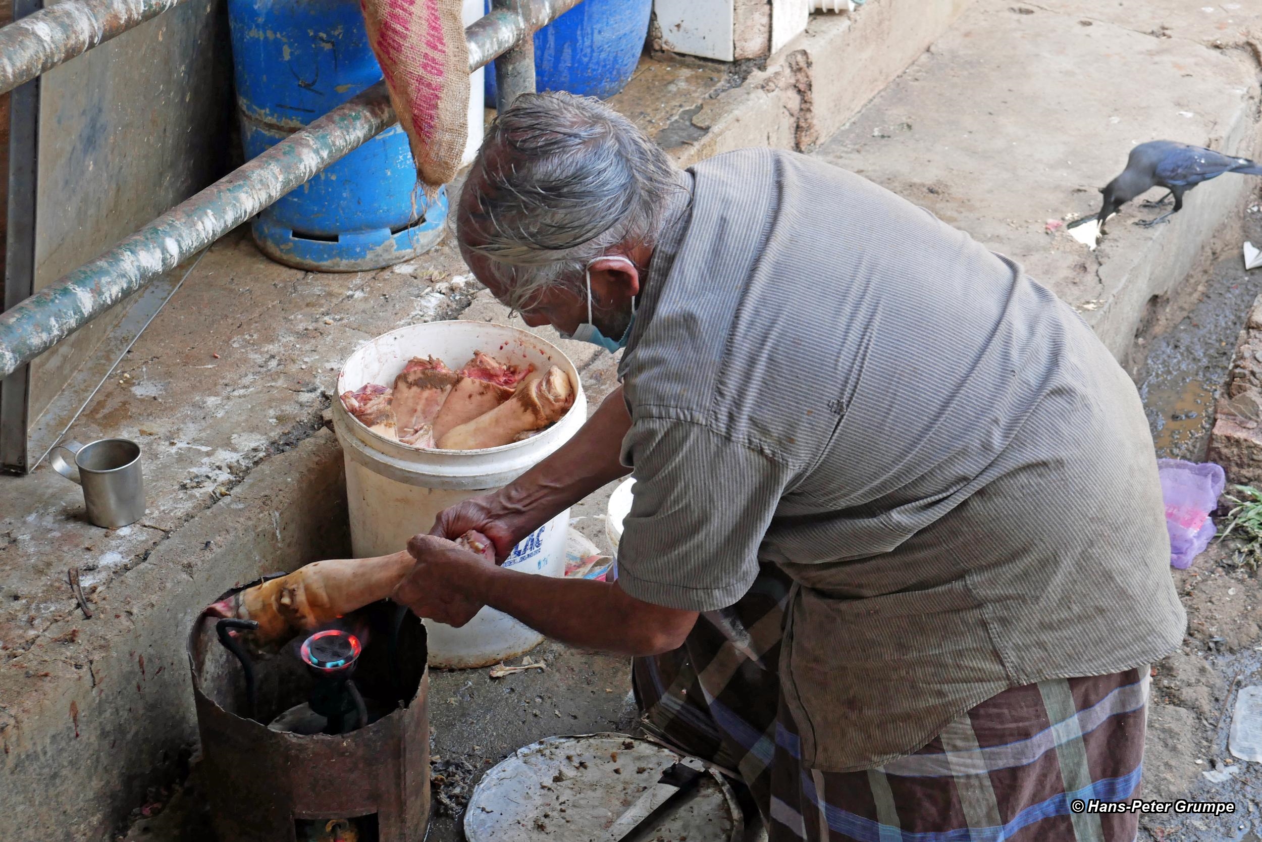 Kandy: Zentralmarkt - Abflämmen von Schweinebeinen
