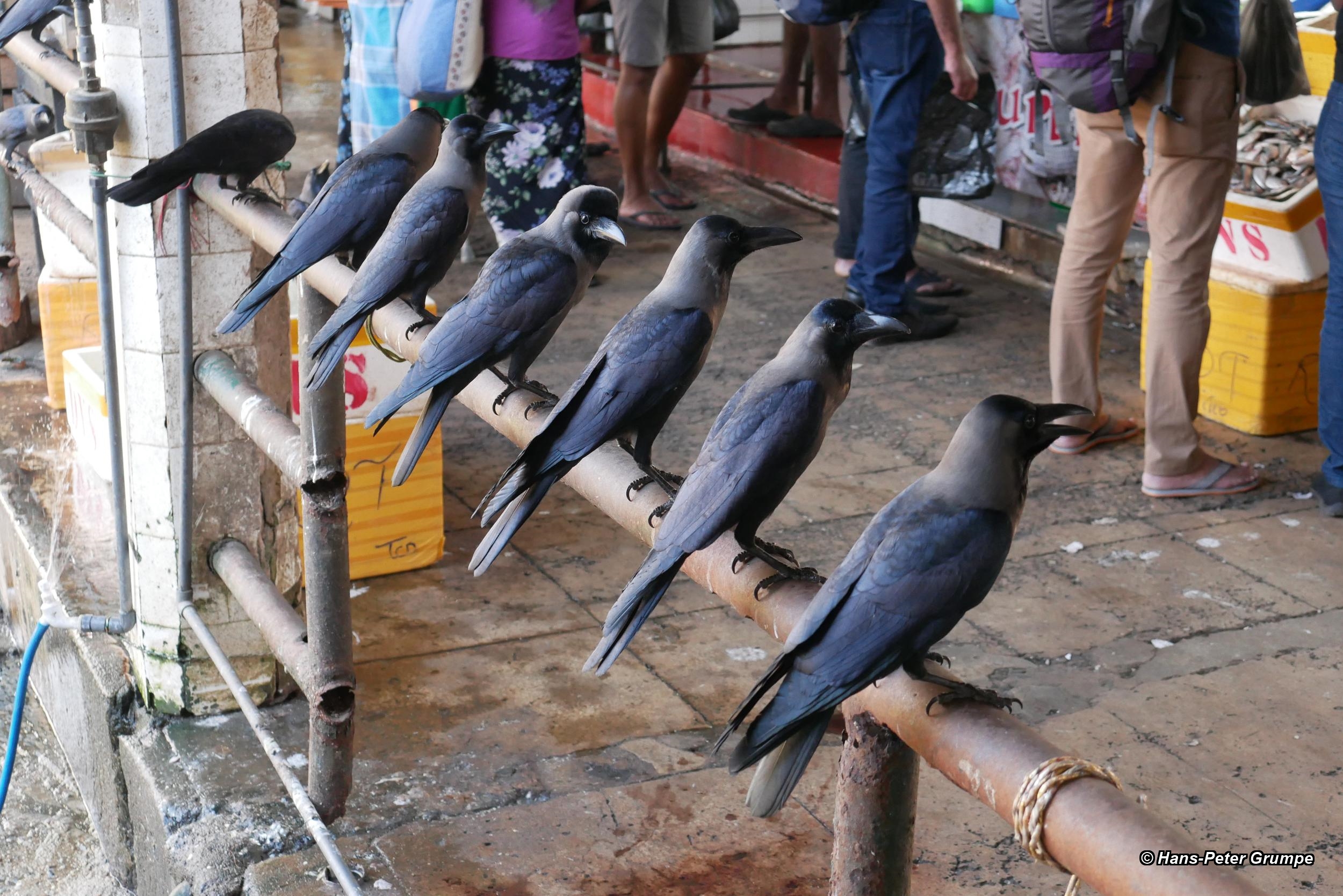 Kandy: Zentralmarkt - Raben warten auf eine günstige Gelegenheit..
