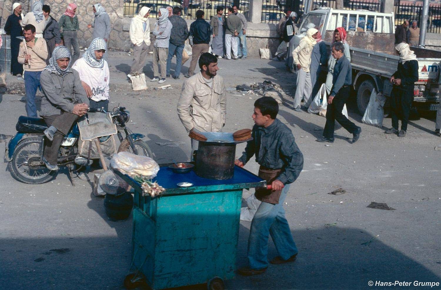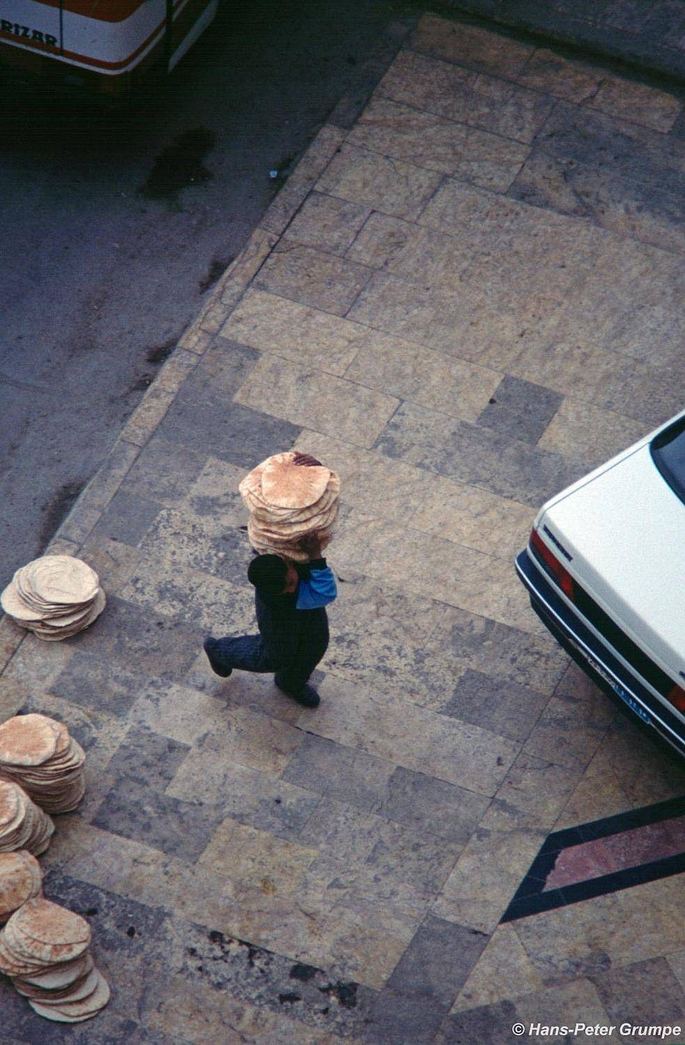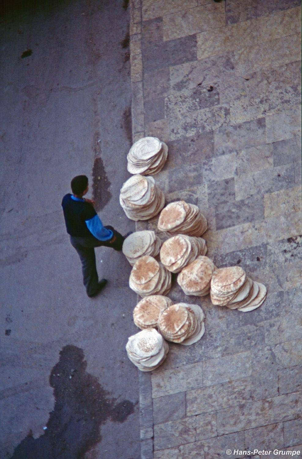 Aleppo: auf dem Bürgersteig gestapelte Fladenbrote