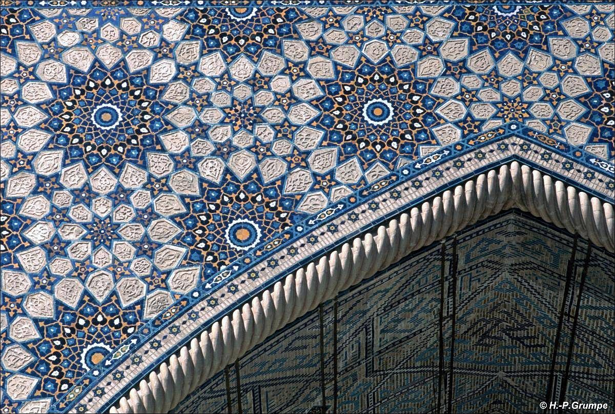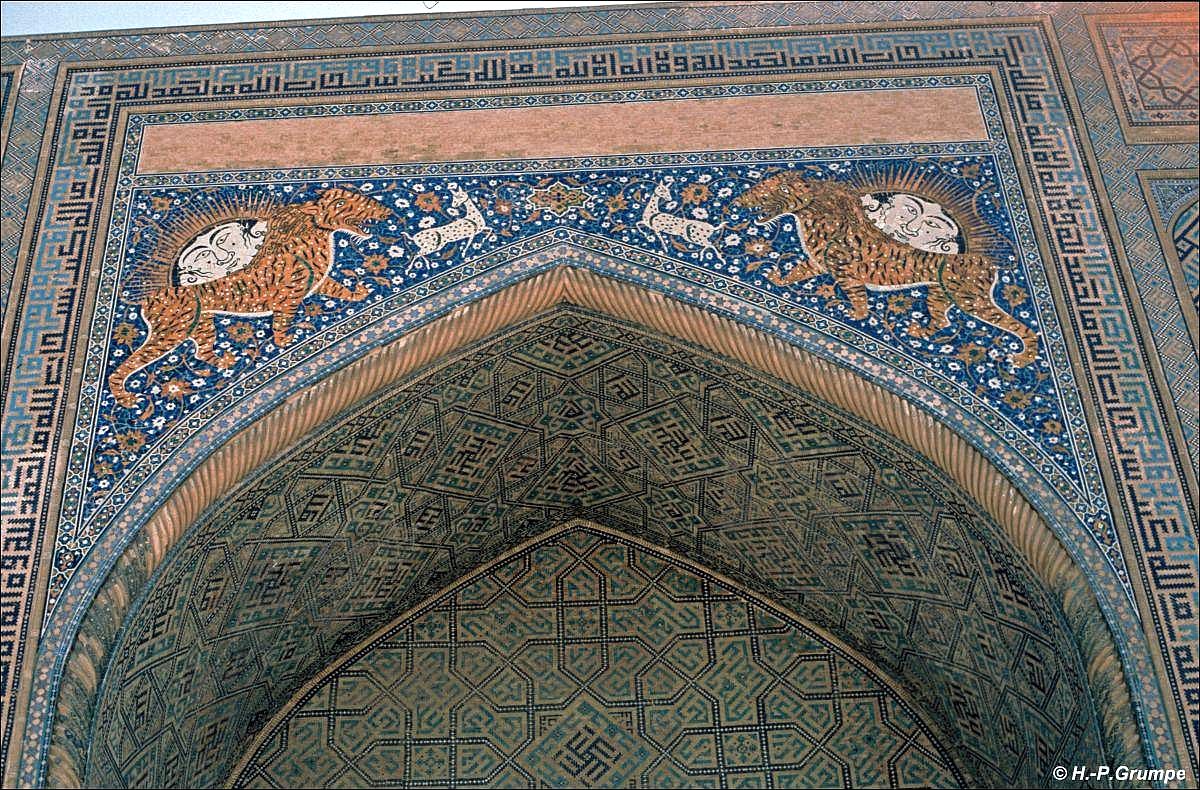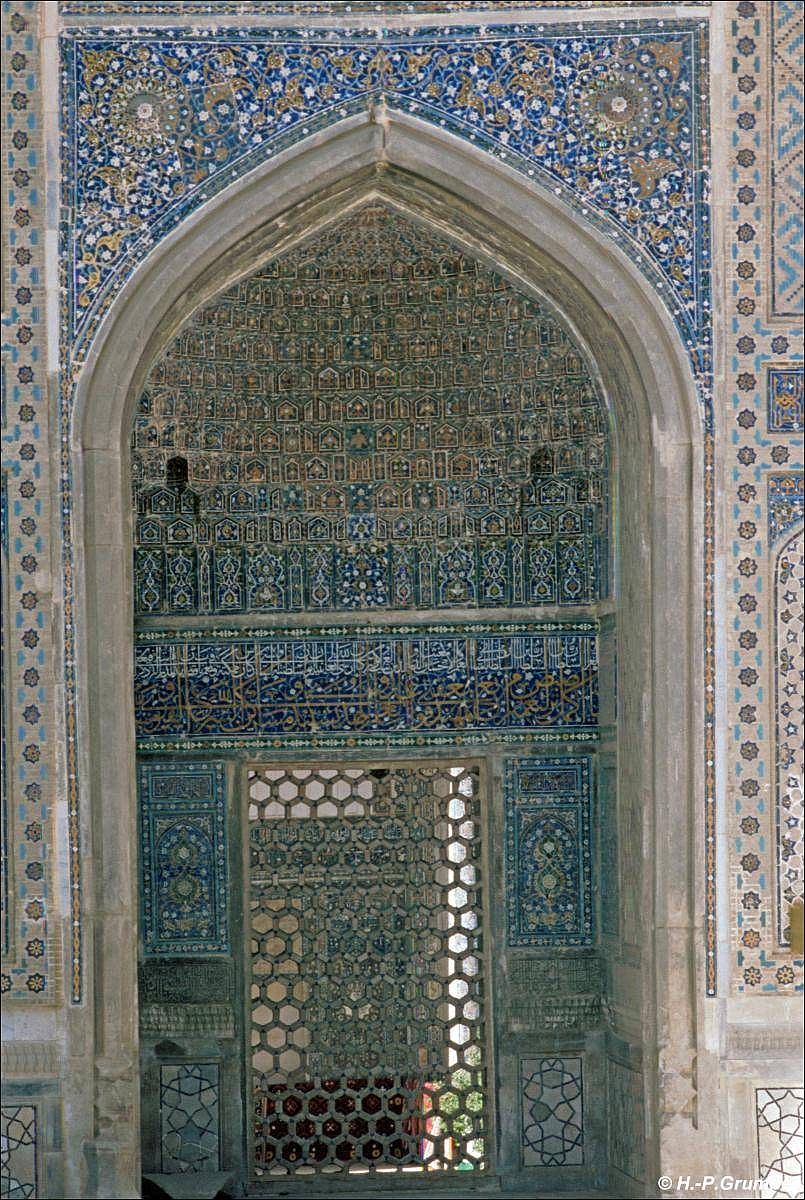 Portal mit einem Hufeisenbogen dem Registanplatz zugerichtet. Die Ecken sind mit