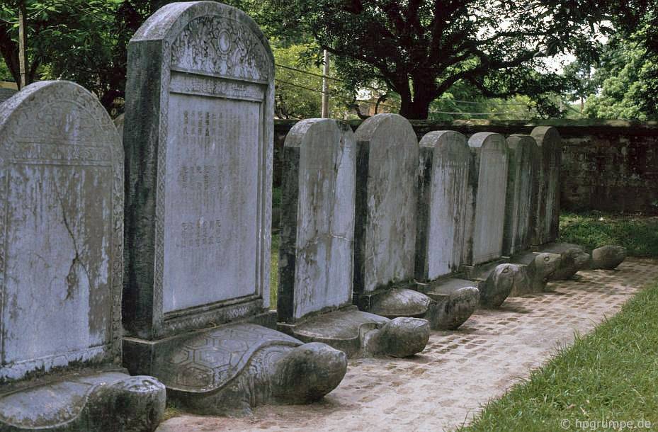 Vor dem Haupteingang steht ein Tor, auf dem eine Inschrift die Besucher auffordert, von ihren Pferden abzusteigen, bevor sie eintreten. Der KHUE VAN-PAVILLON an hinteren Ende des zweiten Hofs wurde 1802 gebaut und gilt als schönes Beispiel vietnamesischer Architektur. Die 82 Stelen, die als wertvollste Stücke des Tempels gelten, sind auf beiden Seiten des dritten Hofs aufgereiht; jede Stele steht auf einer Steinschildkröte......."